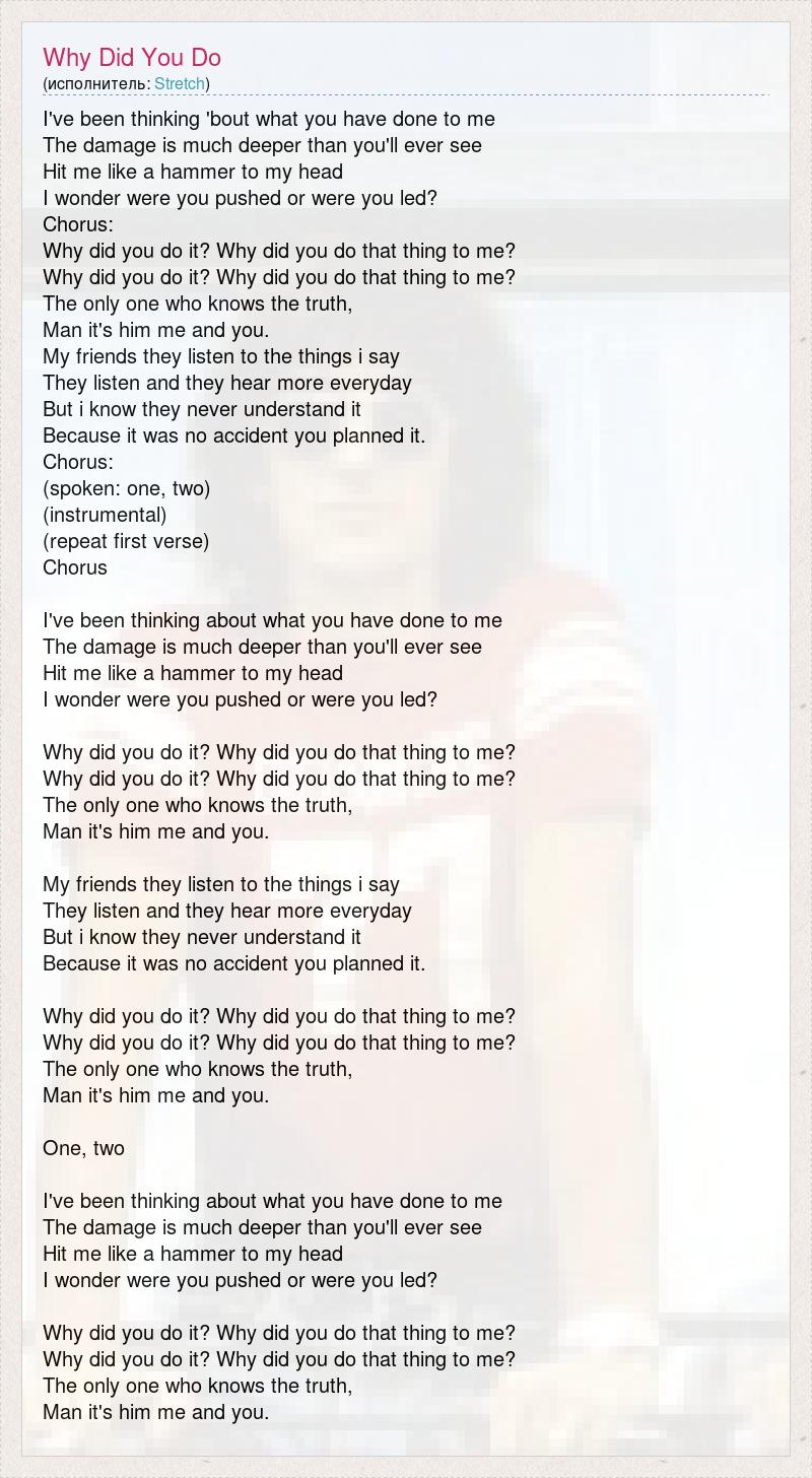 I've been thinking 'bout what you have done to me The damage is much deeper than you'll ever see Hit me like a hammer to my head I wonder were you pushed or were you led? Chorus: Why did you do it? Why did you do that thing to me? Why did you do it? Why did you do that thing to me? The only one who knows the truth, Man it's him me and you. My friends they listen to the things i say They listen and they hear more everyday But i know they never understand it Because it was no accident you planned it. Chorus: (spoken: one, two) (instrumental) (repeat first verse) Chorus I've been thinking about what you have done to me The damage is much deeper than you'll ever see Hit me like a hammer to my head I wonder were you pushed or were you led? Why did you do it? Why did you do that thing to me? Why did you do it? Why did you do that thing to me? The only one who knows the truth, Man it's him me and you. My friends they listen to the things i say They listen and they hear more everyday But i know they never understand it Because it was no accident you planned it. Why did you do it? Why did you do that thing to me? Why did you do it? Why did you do that thing to me? The only one who knows the truth, Man it's him me and you. One, two I've been thinking about what you have done to me The damage is much deeper than you'll ever see Hit me like a hammer to my head I wonder were you pushed or were you led? Why did you do it? Why did you do that thing to me? Why did you do it? Why did you do that thing to me? The only one who knows the truth, Man it's him me and you.