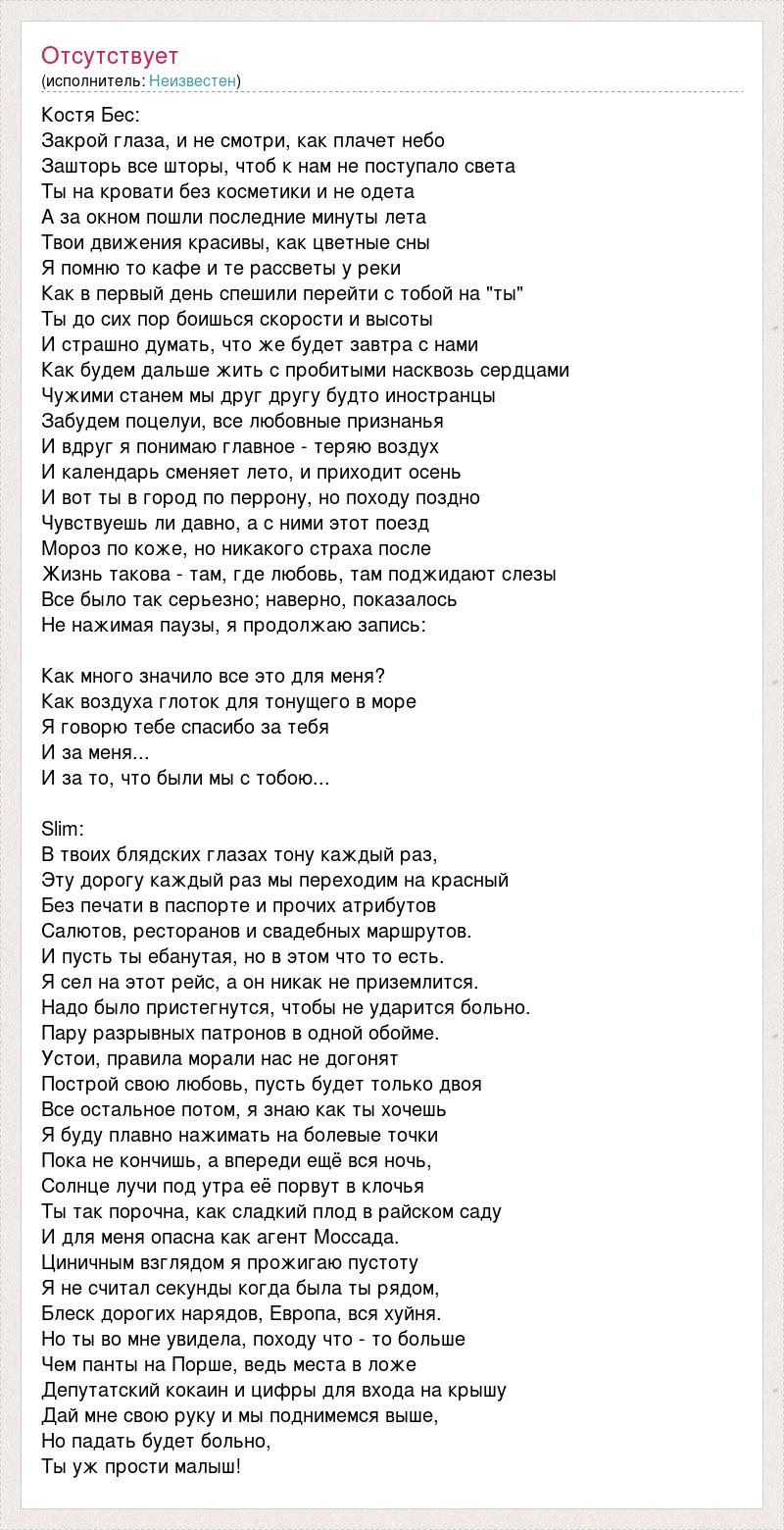 Костя Бес: Закрой глаза, и не смотри, как плачет небо Зашторь все шторы, чтоб к нам не поступало света Ты на кровати без косметики и не одета А за окном пошли последние минуты лета Твои движения красивы, как цветные сны Я помню то кафе и те рассветы у реки Как в первый день спешили перейти с тобой на "ты" Ты до сих пор боишься скорости и высоты И страшно думать, что же будет завтра с нами Как будем дальше жить с пробитыми насквозь сердцами Чужими станем мы друг другу будто иностранцы Забудем поцелуи, все любовные признанья И вдруг я понимаю главное - теряю воздух И календарь сменяет лето, и приходит осень И вот ты в город по перрону, но походу поздно Чувствуешь ли давно, а с ними этот поезд Мороз по коже, но никакого страха после Жизнь такова - там, где любовь, там поджидают слезы Все было так серьезно; наверно, показалось Не нажимая паузы, я продолжаю запись: Как много значило все это для меня? Как воздуха глоток для тонущего в море Я говорю тебе спасибо за тебя И за меня... И за то, что были мы с тобою... Slim: В твоих блядских глазах тону каждый раз, Эту дорогу каждый раз мы переходим на красный Без печати в паспорте и прочих атрибутов Салютов, ресторанов и свадебных маршрутов. И пусть ты ебанутая, но в этом что то есть. Я сел на этот рейс, а он никак не приземлится. Надо было пристегнутся, чтобы не ударится больно. Пару разрывных патронов в одной обойме. Устои, правила морали нас не догонят Построй свою любовь, пусть будет только двоя Все остальное потом, я знаю как ты хочешь Я буду плавно нажимать на болевые точки Пока не кончишь, а впереди ещё вся ночь, Солнце лучи под утра её порвут в клочья Ты так порочна, как сладкий плод в райском саду И для меня опасна как агент Моссада. Циничным взглядом я прожигаю пустоту Я не считал секунды когда была ты рядом, Блеск дорогих нарядов, Европа, вся хуйня. Но ты во мне увидела, походу что - то больше Чем панты на Порше, ведь места в ложе Депутатский кокаин и цифры для входа на крышу Дай мне свою руку и мы поднимемся выше, Но падать будет больно, Ты уж прости малыш!