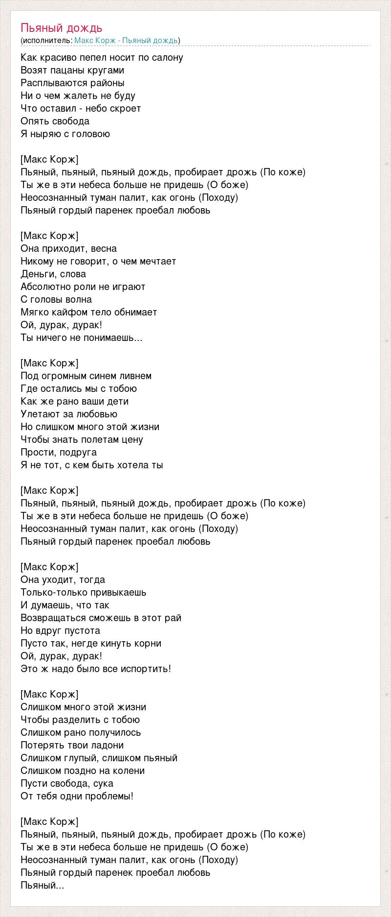 Как красиво пепел носит по салону Возят пацаны кругами Расплываются районы Ни о чем жалеть не буду Что оставил - небо скроет Опять свобода Я ныряю с головою [Макс Корж] Пьяный, пьяный, пьяный дождь, пробирает дрожь (По коже) Ты же в эти небеса больше не придешь (О боже) Неосознанный туман палит, как огонь (Походу) Пьяный гордый паренек проебал любовь [Макс Корж] Она приходит, весна Никому не говорит, о чем мечтает Деньги, слова Абсолютно роли не играют С головы волна Мягко кайфом тело обнимает Ой, дурак, дурак! Ты ничего не понимаешь... [Макс Корж] Под огромным синем ливнем Где остались мы с тобою Как же рано ваши дети Улетают за любовью Но слишком много этой жизни Чтобы знать полетам цену Прости, подруга Я не тот, с кем быть хотела ты [Макс Корж] Пьяный, пьяный, пьяный дождь, пробирает дрожь (По коже) Ты же в эти небеса больше не придешь (О боже) Неосознанный туман палит, как огонь (Походу) Пьяный гордый паренек проебал любовь [Макс Корж] Она уходит, тогда Только-только привыкаешь И думаешь, что так Возвращаться сможешь в этот рай Но вдруг пустота Пусто так, негде кинуть корни Ой, дурак, дурак! Это ж надо было все испортить! [Макс Корж] Слишком много этой жизни Чтобы разделить с тобою Слишком рано получилось Потерять твои ладони Слишком глупый, слишком пьяный Слишком поздно на колени Пусти свобода, сука От тебя одни проблемы! [Макс Корж] Пьяный, пьяный, пьяный дождь, пробирает дрожь (По коже) Ты же в эти небеса больше не придешь (О боже) Неосознанный туман палит, как огонь (Походу) Пьяный гордый паренек проебал любовь Пьяный...