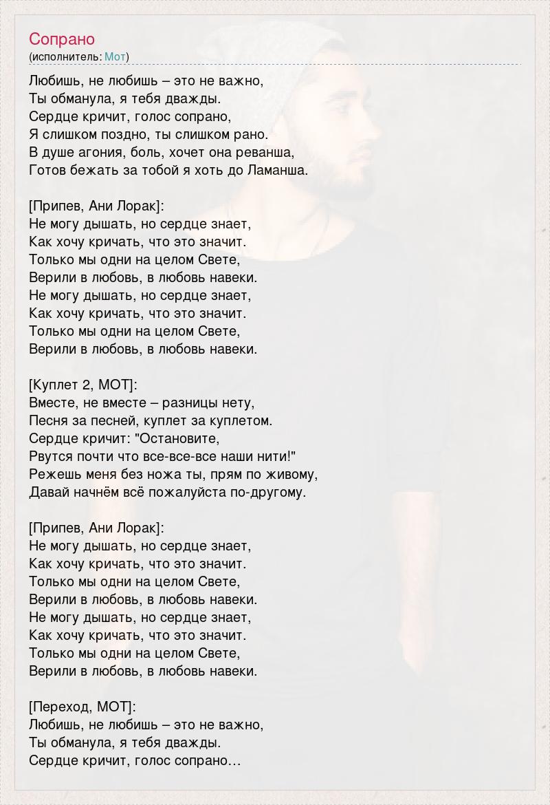 Любишь, не любишь – это не важно, Ты обманула, я тебя дважды. Сердце кричит, голос сопрано, Я слишком поздно, ты слишком рано. В душе агония, боль, хочет она реванша, Готов бежать за тобой я хоть до Ламанша. [Припев, Ани Лорак]: Не могу дышать, но сердце знает, Как хочу кричать, что это значит. Только мы одни на целом Свете, Верили в любовь, в любовь навеки. Не могу дышать, но сердце знает, Как хочу кричать, что это значит. Только мы одни на целом Свете, Верили в любовь, в любовь навеки. [Куплет 2, МОТ]: Вместе, не вместе – разницы нету, Песня за песней, куплет за куплетом. Сердце кричит: "Остановите, Рвутся почти что все-все-все наши нити!" Режешь меня без ножа ты, прям по живому, Давай начнём всё пожалуйста по-другому. [Припев, Ани Лорак]: Не могу дышать, но сердце знает, Как хочу кричать, что это значит. Только мы одни на целом Свете, Верили в любовь, в любовь навеки. Не могу дышать, но сердце знает, Как хочу кричать, что это значит. Только мы одни на целом Свете, Верили в любовь, в любовь навеки. [Переход, МОТ]: Любишь, не любишь – это не важно, Ты обманула, я тебя дважды. Сердце кричит, голос сопрано…