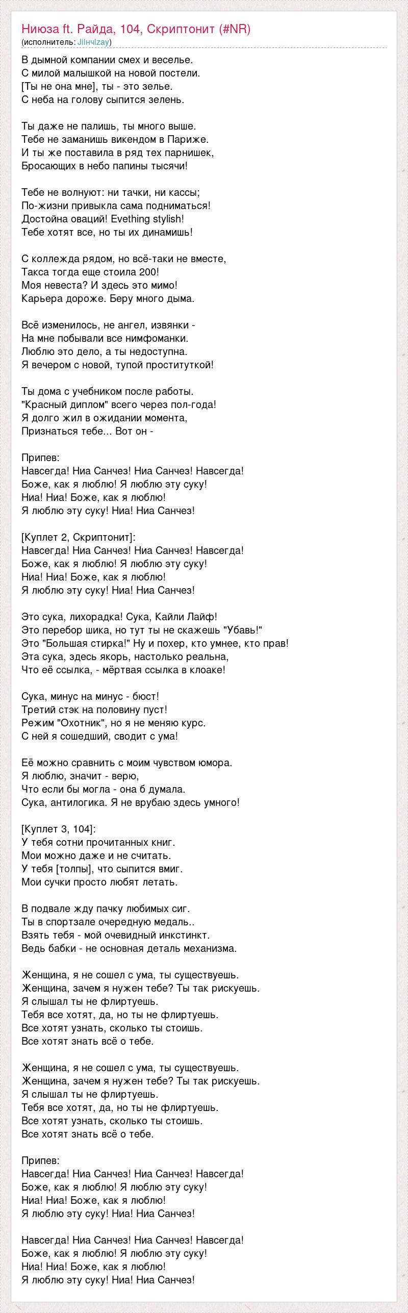 В дымной компании смех и веселье. С милой малышкой на новой постели. [Ты не она мне], ты - это зелье. С неба на голову сыпится зелень. Ты даже не палишь, ты много выше. Тебе не заманишь викендом в Париже. И ты же поставила в ряд тех парнишек, Бросающих в небо папины тысячи! Тебе не волнуют: ни тачки, ни кассы; По-жизни привыкла сама подниматься! Достойна оваций! Evething stylish! Тебе хотят все, но ты их динамишь! С коллежда рядом, но всё-таки не вместе, Такса тогда еще стоила 200! Моя невеста? И здесь это мимо! Карьера дороже. Беру много дыма. Всё изменилось, не ангел, извянки - На мне побывали все нимфоманки. Люблю это дело, а ты недоступна. Я вечером с новой, тупой проституткой! Ты дома с учебником после работы. "Красный диплом" всего через пол-года! Я долго жил в ожидании момента, Признаться тебе... Вот он - Припев: Навсегда! Ниа Санчез! Ниа Санчез! Навсегда! Боже, как я люблю! Я люблю эту суку! Ниа! Ниа! Боже, как я люблю! Я люблю эту суку! Ниа! Ниа Санчез! [Куплет 2, Скриптонит]: Навсегда! Ниа Санчез! Ниа Санчез! Навсегда! Боже, как я люблю! Я люблю эту суку! Ниа! Ниа! Боже, как я люблю! Я люблю эту суку! Ниа! Ниа Санчез! Это сука, лихорадка! Сука, Кайли Лайф! Это перебор шика, но тут ты не скажешь "Убавь!" Это "Большая стирка!" Ну и похер, кто умнее, кто прав! Эта сука, здесь якорь, настолько реальна, Что её ссылка, - мёртвая ссылка в клоаке! Сука, минус на минус - бюст! Третий стэк на половину пуст! Режим "Охотник", но я не меняю курс. С ней я сошедший, сводит с ума! Её можно сравнить с моим чувством юмора. Я люблю, значит - верю, Что если бы могла - она б думала. Сука, антилогика. Я не врубаю здесь умного! [Куплет 3, 104]: У тебя сотни прочитанных книг. Мои можно даже и не считать. У тебя [толпы], что сыпится вмиг. Мои сучки просто любят летать. В подвале жду пачку любимых сиг. Ты в спортзале очередную медаль.. Взять тебя - мой очевидный инкстинкт. Ведь бабки - не основная деталь механизма. Женщина, я не сошел с ума, ты существуешь. Женщина, зачем я нужен тебе? Ты так рискуешь. Я слышал ты не флиртуешь. Тебя все хотят, да, но ты не флиртуешь. Все хотят узнать, сколько ты стоишь. Все хотят знать всё о тебе. Женщина, я не сошел с ума, ты существуешь. Женщина, зачем я нужен тебе? Ты так рискуешь. Я слышал ты не флиртуешь. Тебя все хотят, да, но ты не флиртуешь. Все хотят узнать, сколько ты стоишь. Все хотят знать всё о тебе. Припев: Навсегда! Ниа Санчез! Ниа Санчез! Навсегда! Боже, как я люблю! Я люблю эту суку! Ниа! Ниа! Боже, как я люблю! Я люблю эту суку! Ниа! Ниа Санчез! Навсегда! Ниа Санчез! Ниа Санчез! Навсегда! Боже, как я люблю! Я люблю эту суку! Ниа! Ниа! Боже, как я люблю! Я люблю эту суку! Ниа! Ниа Санчез!