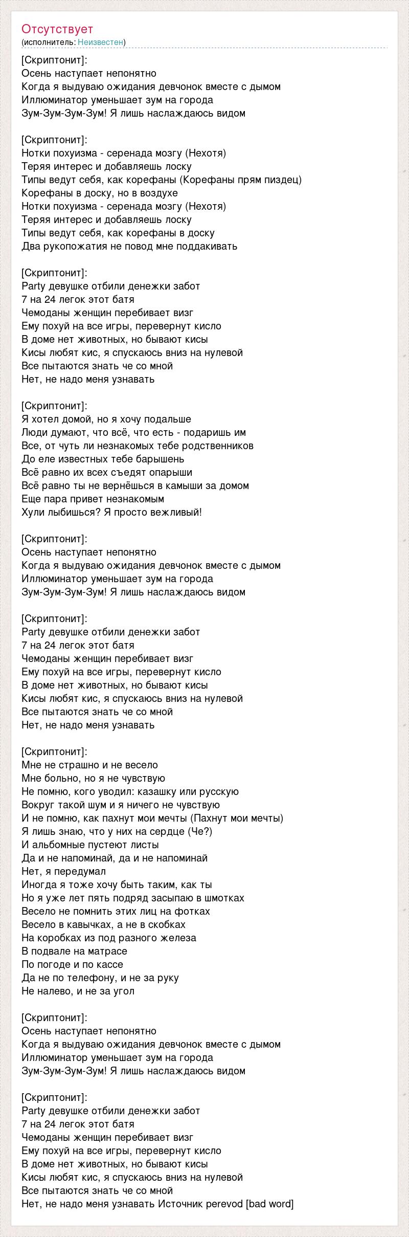 [Скриптонит]: Осень наступает непонятно Когда я выдуваю ожидания девчонок вместе с дымом Иллюминатор уменьшает зум на города Зум-Зум-Зум-Зум! Я лишь наслаждаюсь видом [Скриптонит]: Нотки похуизма - серенада мозгу (Нехотя) Теряя интерес и добавляешь лоску Типы ведут себя, как корефаны (Корефаны прям пиздец) Корефаны в доску, но в воздухе Нотки похуизма - серенада мозгу (Нехотя) Теряя интерес и добавляешь лоску Типы ведут себя, как корефаны в доску Два рукопожатия не повод мне поддакивать [Скриптонит]: Party девушке отбили денежки забот 7 на 24 легок этот батя Чемоданы женщин перебивает визг Ему похуй на все игры, перевернут кисло В доме нет животных, но бывают кисы Кисы любят кис, я спускаюсь вниз на нулевой Все пытаются знать че со мной Нет, не надо меня узнавать [Скриптонит]: Я хотел домой, но я хочу подальше Люди думают, что всё, что есть - подаришь им Все, от чуть ли незнакомых тебе родственников До еле известных тебе барышень Всё равно их всех съедят опарыши Всё равно ты не вернёшься в камыши за домом Еще пара привет незнакомым Хули лыбишься? Я просто вежливый! [Скриптонит]: Осень наступает непонятно Когда я выдуваю ожидания девчонок вместе с дымом Иллюминатор уменьшает зум на города Зум-Зум-Зум-Зум! Я лишь наслаждаюсь видом [Скриптонит]: Party девушке отбили денежки забот 7 на 24 легок этот батя Чемоданы женщин перебивает визг Ему похуй на все игры, перевернут кисло В доме нет животных, но бывают кисы Кисы любят кис, я спускаюсь вниз на нулевой Все пытаются знать че со мной Нет, не надо меня узнавать [Скриптонит]: Мне не страшно и не весело Мне больно, но я не чувствую Не помню, кого уводил: казашку или русскую Вокруг такой шум и я ничего не чувствую И не помню, как пахнут мои мечты (Пахнут мои мечты) Я лишь знаю, что у них на сердце (Че?) И альбомные пустеют листы Да и не напоминай, да и не напоминай Нет, я передумал Иногда я тоже хочу быть таким, как ты Но я уже лет пять подряд засыпаю в шмотках Весело не помнить этих лиц на фотках Весело в кавычках, а не в скобках На коробках из под разного железа В подвале на матрасе По погоде и по кассе Да не по телефону, и не за руку Не налево, и не за угол [Скриптонит]: Осень наступает непонятно Когда я выдуваю ожидания девчонок вместе с дымом Иллюминатор уменьшает зум на города Зум-Зум-Зум-Зум! Я лишь наслаждаюсь видом [Скриптонит]: Party девушке отбили денежки забот 7 на 24 легок этот батя Чемоданы женщин перебивает визг Ему похуй на все игры, перевернут кисло В доме нет животных, но бывают кисы Кисы любят кис, я спускаюсь вниз на нулевой Все пытаются знать че со мной Нет, не надо меня узнавать Источник perevod [bad word]