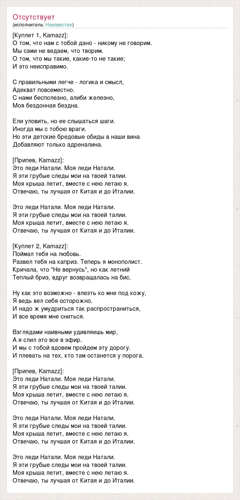 [Куплет 1, Kamazz]: О том, что нам с тобой дано - никому не говорим. Мы сами не ведаем, что творим. О том, что мы такие, какие-то не такие; И это неисправимо. С правильными легче - логика и смысл, Адекват повсеместно. С нами бесполезно, алиби железно, Моя бездонная бездна. Ели уловить, но ее слышаться шаги. Иногда мы с тобою враги. Но эти детские бредовые обиды в наши вина Добавляют только адреналина. [Припев, Kamazz]: Это леди Натали. Моя леди Натали. Я эти грубые следы мои на твоей талии. Моя крыша летит, вместе с нею летаю я. Отвечаю, ты лучшая от Китая и до Италии. Это леди Натали. Моя леди Натали. Я эти грубые следы мои на твоей талии. Моя крыша летит, вместе с нею летаю я. Отвечаю, ты лучшая от Китая и до Италии. [Куплет 2, Kamazz]: Поймал тебя на любовь. Развел тебя на каприз. Теперь я монополист. Кричала, что "Не вернусь", но как летний Теплый бриз, вдруг возвращалась на бис. Ну как это возможно - влезть ко мне под кожу, Я ведь вел себя осторожно. И надо ж умудриться так распространиться, И все время мне сниться. Взглядами наивными удивляешь мир, А я слил это все в эфир. И мы с тобой вдовем пройдем эту дорогу. И плевать на тех, кто там останется у порога. [Припев, Kamazz]: Это леди Натали. Моя леди Натали. Я эти грубые следы мои на твоей талии. Моя крыша летит, вместе с нею летаю я. Отвечаю, ты лучшая от Китая и до Италии. Это леди Натали. Моя леди Натали. Я эти грубые следы мои на твоей талии. Моя крыша летит, вместе с нею летаю я. Отвечаю, ты лучшая от Китая и до Италии. Это леди Натали. Моя леди Натали. Я эти грубые следы мои на твоей талии. Моя крыша летит, вместе с нею летаю я. Отвечаю, ты лучшая от Китая и до Италии.