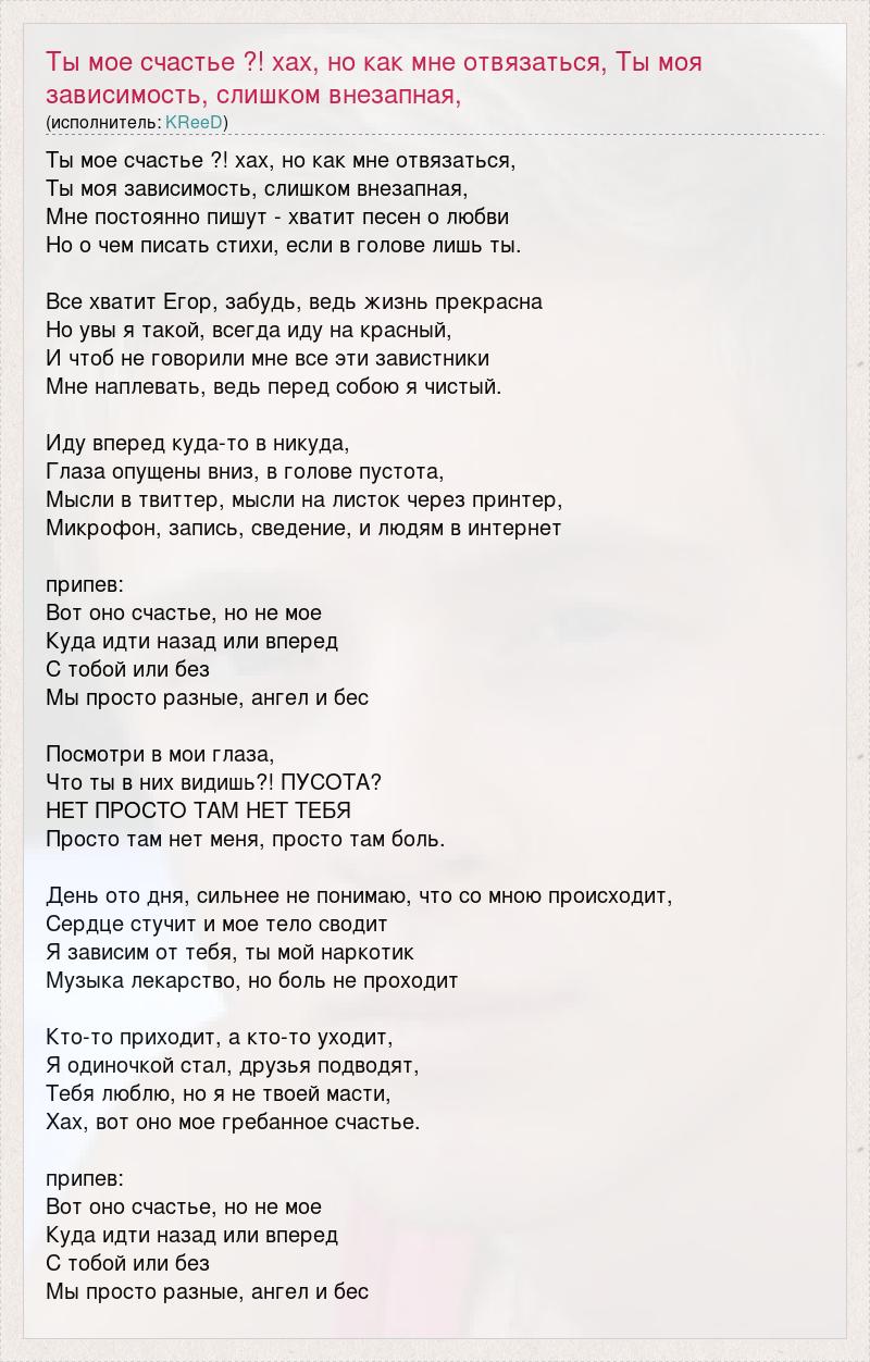 Ты мое счастье ?! хах, но как мне отвязаться, Ты моя зависимость, слишком внезапная, Мне постоянно пишут - хватит песен о любви Но о чем писать стихи, если в голове лишь ты. Все хватит Егор, забудь, ведь жизнь прекрасна Но увы я такой, всегда иду на красный, И чтоб не говорили мне все эти завистники Мне наплевать, ведь перед собою я чистый. Иду вперед куда-то в никуда, Глаза опущены вниз, в голове пустота, Мысли в твиттер, мысли на листок через принтер, Микрофон, запись, сведение, и людям в интернет припев: Вот оно счастье, но не мое Куда идти назад или вперед С тобой или без Мы просто разные, ангел и бес Посмотри в мои глаза, Что ты в них видишь?! ПУСОТА? НЕТ ПРОСТО ТАМ НЕТ ТЕБЯ Просто там нет меня, просто там боль. День ото дня, сильнее не понимаю, что со мною происходит, Сердце стучит и мое тело сводит Я зависим от тебя, ты мой наркотик Музыка лекарство, но боль не проходит Кто-то приходит, а кто-то уходит, Я одиночкой стал, друзья подводят, Тебя люблю, но я не твоей масти, Хах, вот оно мое гребанное счастье. припев: Вот оно счастье, но не мое Куда идти назад или вперед С тобой или без Мы просто разные, ангел и бес