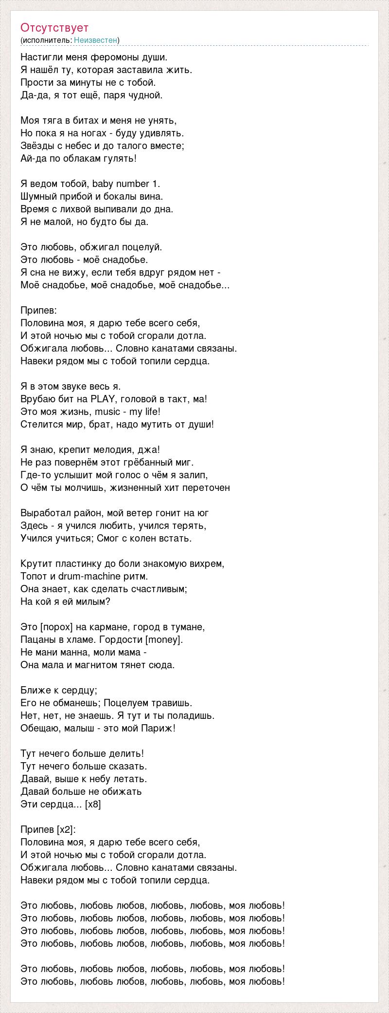 Настигли меня феромоны души. Я нашёл ту, которая заставила жить. Прости за минуты не с тобой. Да-да, я тот ещё, паря чудной. Моя тяга в битах и меня не унять, Но пока я на ногах - буду удивлять. Звёзды с небес и до талого вместе; Ай-да по облакам гулять! Я ведом тобой, baby number 1. Шумный прибой и бокалы вина. Время с лихвой выпивали до дна. Я не малой, но будто бы да. Это любовь, обжигал поцелуй. Это любовь - моё снадобье. Я сна не вижу, если тебя вдруг рядом нет - Моё снадобье, моё снадобье, моё снадобье... Припев: Половина моя, я дарю тебе всего себя, И этой ночью мы с тобой сгорали дотла. Обжигала любовь... Словно канатами связаны. Навеки рядом мы с тобой топили сердца. Я в этом звуке весь я. Врубаю бит на PLAY, головой в такт, ма! Это моя жизнь, music - my life! Стелится мир, брат, надо мутить от души! Я знаю, крепит мелодия, джа! Не раз повернём этот грёбанный миг. Где-то услышит мой голос о чём я залип, О чём ты молчишь, жизненный хит переточен Выработал район, мой ветер гонит на юг Здесь - я учился любить, учился терять, Учился учиться; Смог с колен встать. Крутит пластинку до боли знакомую вихрем, Топот и drum-machine ритм. Она знает, как сделать счастливым; На кой я ей милым? Это [порох] на кармане, город в тумане, Пацаны в хламе. Гордости [money]. Не мани манна, моли мама - Она мала и магнитом тянет сюда. Ближе к сердцу; Его не обманешь; Поцелуем травишь. Нет, нет, не знаешь. Я тут и ты поладишь. Обещаю, малыш - это мой Париж! Тут нечего больше делить! Тут нечего больше сказать. Давай, выше к небу летать. Давай больше не обижать Эти сердца... [x8] Припев [x2]: Половина моя, я дарю тебе всего себя, И этой ночью мы с тобой сгорали дотла. Обжигала любовь... Словно канатами связаны. Навеки рядом мы с тобой топили сердца. Это любовь, любовь любов, любовь, любовь, моя любовь! Это любовь, любовь любов, любовь, любовь, моя любовь! Это любовь, любовь любов, любовь, любовь, моя любовь! Это любовь, любовь любов, любовь, любовь, моя любовь! Это любовь, любовь любов, любовь, любовь, моя любовь! Это любовь, любовь любов, любовь, любовь, моя любовь!