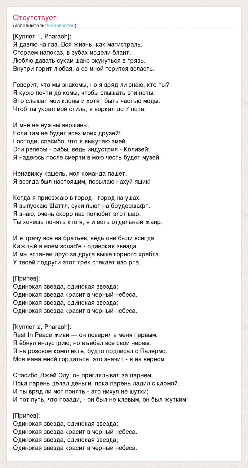 [Куплет 1, Pharaoh]: Я давлю на газ. Вся жизнь, как магистраль. Сгораем напоказ, в зубах модели блант. Люблю давать сукам шанс окунуться в грязь. Внутри горит любая, а со мной горится всласть. Говорит, что мы знакомы, но я вряд ли знаю, кто ты? Я курю почти до комы, чтобы слышать эти ноты. Это слышат мои клоны и хотят быть частью моды. Чтоб ты украл мой стиль, я воркал до 7 пота. И мне не нужны вершины, Если там не будет всех моих друзей! Господи, спасибо, что я выкупаю змей. Эти рэперы - рабы, ведь индустрия - Колизей; Я надеюсь после смерти в мою честь будет музей. Ненавижу кашель, моя команда пашет. Я всегда был настоящим, посылаю нахуй ящик! Когда я приезжаю в город - город на ушах. Я выпускаю Шаттл, суки пьют на брудершафт. Я знаю, очень скоро нас полюбит этот шар. Ты хочешь понять кто я, я и есть отдельный жанр. И я трачу все на братьев, ведь они были всегда. Каждый в моем squad'е - одинокая звезда. И мы встанем друг за друга выше горного хребта. У твоей подруги этот трек стекает изо рта. [Припев]: Одинокая звезда, одинокая звезда; Одинокая звезда красит в черный небеса. Одинокая звезда, одинокая звезда; Одинокая звезда красит в черный небеса. [Куплет 2, Pharaoh]: Rest In Peace живи — он поверил в меня первым. Я ёбнул индустрию, но въебал все свои нервы. Я на розовом комплекте, будто подписал с Палермо. Моя мама мной гордиться, это значит - я на верном. Спасибо Джей Элу, он приглядывал за парнем, Пока парень делал деньги, пока парень ладил с кармой. И ты вряд ли мог понять - это нихуя не шутки; И тот путь, что позади, - он был не клевым, он был жутким! [Припев]: Одинокая звезда, одинокая звезда; Одинокая звезда красит в черный небеса. Одинокая звезда, одинокая звезда; Одинокая звезда красит в черный небеса.