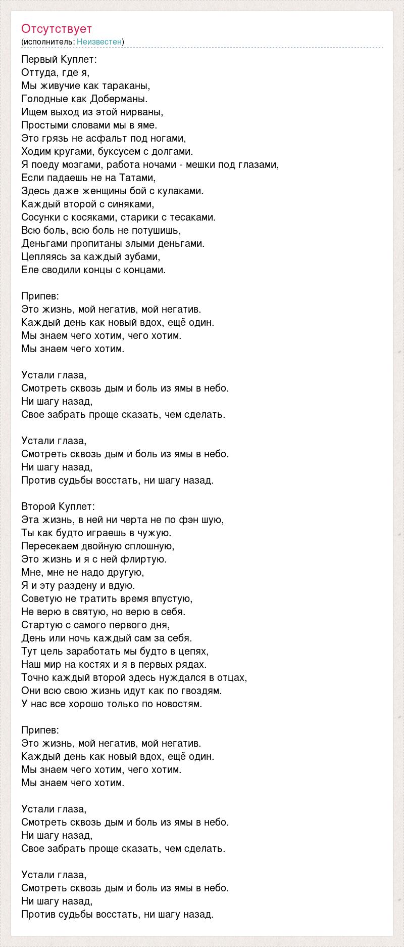 Первый Куплет: Оттуда, где я, Мы живучие как тараканы, Голодные как Доберманы. Ищем выход из этой нирваны, Простыми словами мы в яме. Это грязь не асфальт под ногами, Ходим кругами, буксусем с долгами. Я поеду мозгами, работа ночами - мешки под глазами, Если падаешь не на Татами, Здесь даже женщины бой с кулаками. Каждый второй с синяками, Сосунки с косяками, старики с тесаками. Всю боль, всю боль не потушишь, Деньгами пропитаны злыми деньгами. Цепляясь за каждый зубами, Еле сводили концы с концами. Припев: Это жизнь, мой негатив, мой негатив. Каждый день как новый вдох, ещё один. Мы знаем чего хотим, чего хотим. Мы знаем чего хотим. Устали глаза, Смотреть сквозь дым и боль из ямы в небо. Ни шагу назад, Свое забрать проще сказать, чем сделать. Устали глаза, Смотреть сквозь дым и боль из ямы в небо. Ни шагу назад, Против судьбы восстать, ни шагу назад. Второй Куплет: Эта жизнь, в ней ни черта не по фэн шую, Ты как будто играешь в чужую. Пересекаем двойную сплошную, Это жизнь и я с ней флиртую. Мне, мне не надо другую, Я и эту раздену и вдую. Советую не тратить время впустую, Не верю в святую, но верю в себя. Стартую с самого первого дня, День или ночь каждый сам за себя. Тут цель заработать мы будто в цепях, Наш мир на костях и я в первых рядах. Точно каждый второй здесь нуждался в отцах, Они всю свою жизнь идут как по гвоздям. У нас все хорошо только по новостям. Припев: Это жизнь, мой негатив, мой негатив. Каждый день как новый вдох, ещё один. Мы знаем чего хотим, чего хотим. Мы знаем чего хотим. Устали глаза, Смотреть сквозь дым и боль из ямы в небо. Ни шагу назад, Свое забрать проще сказать, чем сделать. Устали глаза, Смотреть сквозь дым и боль из ямы в небо. Ни шагу назад, Против судьбы восстать, ни шагу назад.
