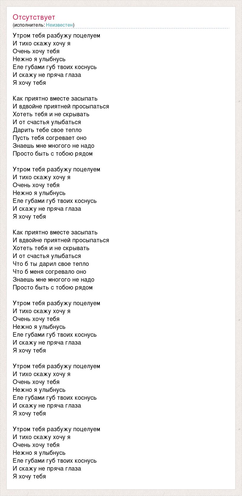 Утром тебя разбужу поцелуем И тихо скажу хочу я Очень хочу тебя Нежно я улыбнусь Еле губами губ твоих коснусь И скажу не пряча глаза Я хочу тебя Как приятно вместе засыпать И вдвойне приятней просыпаться Хотеть тебя и не скрывать И от счастья улыбаться Дарить тебе свое тепло Пусть тебя согревает оно Знаешь мне многого не надо Просто быть с тобою рядом Утром тебя разбужу поцелуем И тихо скажу хочу я Очень хочу тебя Нежно я улыбнусь Еле губами губ твоих коснусь И скажу не пряча глаза Я хочу тебя Как приятно вместе засыпать И вдвойне приятней просыпаться Хотеть тебя и не скрывать И от счастья улыбаться Что б ты дарил свое тепло Что б меня согревало оно Знаешь мне многого не надо Просто быть с тобою рядом Утром тебя разбужу поцелуем И тихо скажу хочу я Очень хочу тебя Нежно я улыбнусь Еле губами губ твоих коснусь И скажу не пряча глаза Я хочу тебя Утром тебя разбужу поцелуем И тихо скажу хочу я Очень хочу тебя Нежно я улыбнусь Еле губами губ твоих коснусь И скажу не пряча глаза Я хочу тебя Утром тебя разбужу поцелуем И тихо скажу хочу я Очень хочу тебя Нежно я улыбнусь Еле губами губ твоих коснусь И скажу не пряча глаза Я хочу тебя
