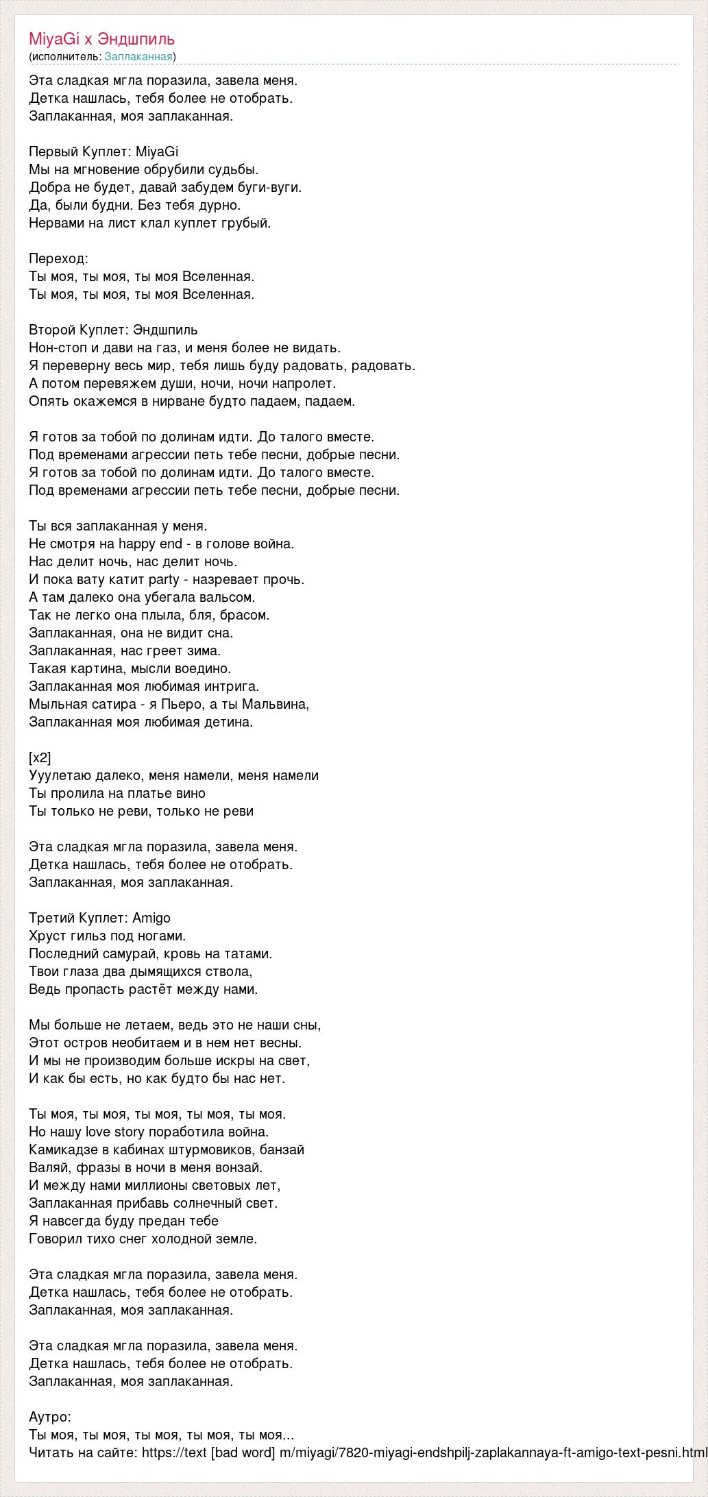 Эта сладкая мгла поразила, завела меня. Детка нашлась, тебя более не отобрать. Заплаканная, моя заплаканная. Первый Куплет: MiyaGi Мы на мгновение обрубили судьбы. Добра не будет, давай забудем буги-вуги. Да, были будни. Без тебя дурно. Нервами на лист клал куплет грубый. Переход: Ты моя, ты моя, ты моя Вселенная. Ты моя, ты моя, ты моя Вселенная. Второй Куплет: Эндшпиль Нон-стоп и дави на газ, и меня более не видать. Я переверну весь мир, тебя лишь буду радовать, радовать. А потом перевяжем души, ночи, ночи напролет. Опять окажемся в нирване будто падаем, падаем. Я готов за тобой по долинам идти. До талого вместе. Под временами агрессии петь тебе песни, добрые песни. Я готов за тобой по долинам идти. До талого вместе. Под временами агрессии петь тебе песни, добрые песни. Ты вся заплаканная у меня. Не смотря на happy end - в голове война. Нас делит ночь, нас делит ночь. И пока вату катит party - назревает прочь. А там далеко она убегала вальсом. Так не легко она плыла, бля, брасом. Заплаканная, она не видит сна. Заплаканная, нас греет зима. Такая картина, мысли воедино. Заплаканная моя любимая интрига. Мыльная сатира - я Пьеро, а ты Мальвина, Заплаканная моя любимая детина. [x2] Ууулетаю далеко, меня намели, меня намели Ты пролила на платье вино Ты только не реви, только не реви Эта сладкая мгла поразила, завела меня. Детка нашлась, тебя более не отобрать. Заплаканная, моя заплаканная. Третий Куплет: Amigo Хруст гильз под ногами. Последний самурай, кровь на татами. Твои глаза два дымящихся ствола, Ведь пропасть растёт между нами. Мы больше не летаем, ведь это не наши сны, Этот остров необитаем и в нем нет весны. И мы не производим больше искры на свет, И как бы есть, но как будто бы нас нет. Ты моя, ты моя, ты моя, ты моя, ты моя. Но нашу love story поработила война. Камикадзе в кабинах штурмовиков, банзай Валяй, фразы в ночи в меня вонзай. И между нами миллионы световых лет, Заплаканная прибавь солнечный свет. Я навсегда буду предан тебе Говорил тихо снег холодной земле. Эта сладкая мгла поразила, завела меня. Детка нашлась, тебя более не отобрать. Заплаканная, моя заплаканная. Эта сладкая мгла поразила, завела меня. Детка нашлась, тебя более не отобрать. Заплаканная, моя заплаканная. Аутро: Ты моя, ты моя, ты моя, ты моя, ты моя... Читать на сайте: https://text [bad word] m/miyagi/7820-miyagi-endshpilj-zaplakannaya-ft-amigo-text-pesni.html