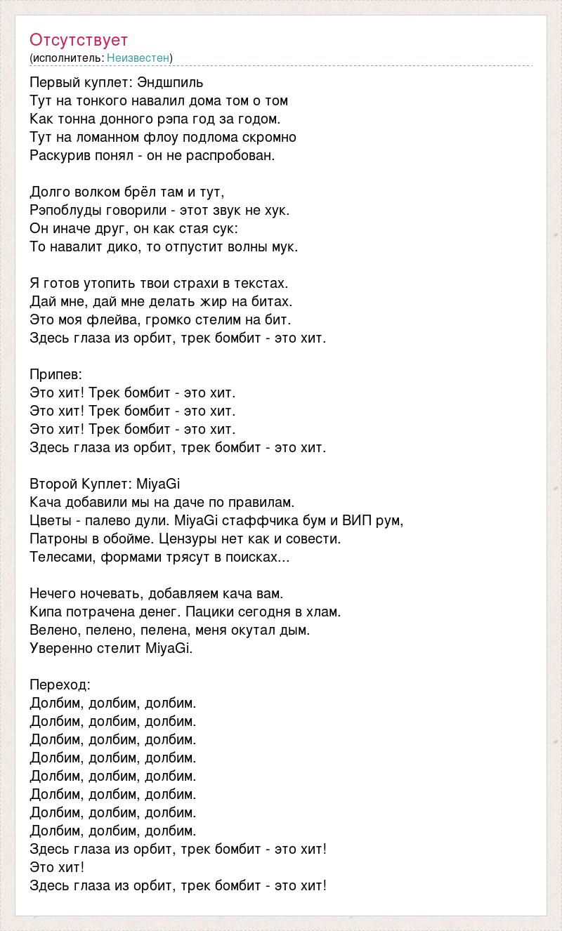 Первый куплет: Эндшпиль Тут на тонкого навалил дома том о том Как тонна донного рэпа год за годом. Тут на ломанном флоу подлома скромно Раскурив понял - он не распробован. Долго волком брёл там и тут, Рэпоблуды говорили - этот звук не хук. Он иначе друг, он как стая сук: То навалит дико, то отпустит волны мук. Я готов утопить твои страхи в текстах. Дай мне, дай мне делать жир на битах. Это моя флейва, громко стелим на бит. Здесь глаза из орбит, трек бомбит - это хит. Припев: Это хит! Трек бомбит - это хит. Это хит! Трек бомбит - это хит. Это хит! Трек бомбит - это хит. Здесь глаза из орбит, трек бомбит - это хит. Второй Куплет: MiyaGi Кача добавили мы на даче по правилам. Цветы - палево дули. MiyaGi стаффчика бум и ВИП рум, Патроны в обойме. Цензуры нет как и совести. Телесами, формами трясут в поисках... Нечего ночевать, добавляем кача вам. Кипа потрачена денег. Пацики сегодня в хлам. Велено, пелено, пелена, меня окутал дым. Уверенно стелит MiyaGi. Переход: Долбим, долбим, долбим. Долбим, долбим, долбим. Долбим, долбим, долбим. Долбим, долбим, долбим. Долбим, долбим, долбим. Долбим, долбим, долбим. Долбим, долбим, долбим. Долбим, долбим, долбим. Здесь глаза из орбит, трек бомбит - это хит! Это хит! Здесь глаза из орбит, трек бомбит - это хит!