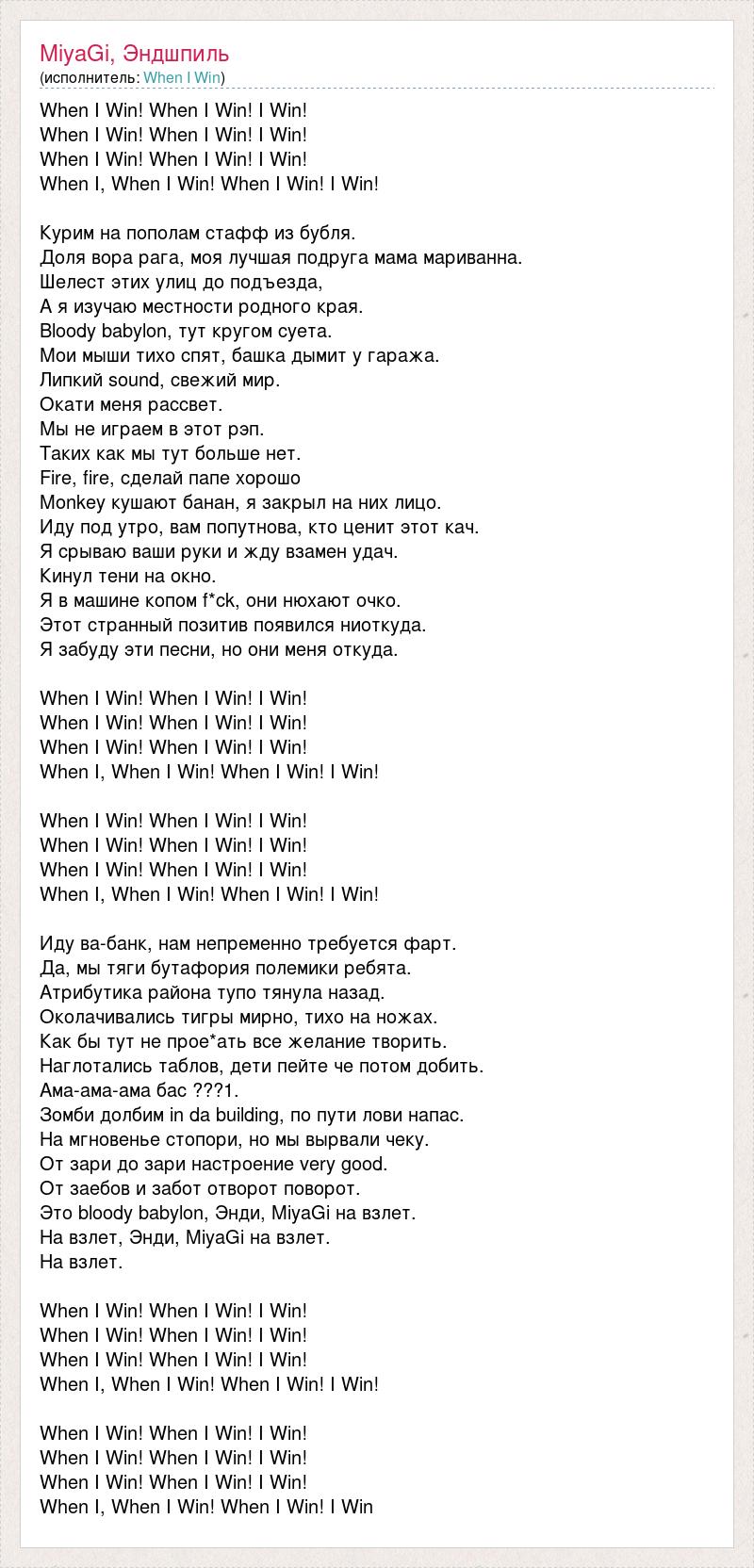 When I Win! When I Win! I Win! When I Win! When I Win! I Win! When I Win! When I Win! I Win! When I, When I Win! When I Win! I Win! Курим на пополам стафф из бубля. Доля вора рага, моя лучшая подруга мама мариванна. Шелест этих улиц до подъезда, А я изучаю местности родного края. Bloody babylon, тут кругом суета. Мои мыши тихо спят, башка дымит у гаража. Липкий sound, свежий мир. Окати меня рассвет. Мы не играем в этот рэп. Таких как мы тут больше нет. Fire, fire, сделай папе хорошо Monkey кушают банан, я закрыл на них лицо. Иду под утро, вам попутнова, кто ценит этот кач. Я срываю ваши руки и жду взамен удач. Кинул тени на окно. Я в машине копом f*ck, они нюхают очко. Этот странный позитив появился ниоткуда. Я забуду эти песни, но они меня откуда. When I Win! When I Win! I Win! When I Win! When I Win! I Win! When I Win! When I Win! I Win! When I, When I Win! When I Win! I Win! When I Win! When I Win! I Win! When I Win! When I Win! I Win! When I Win! When I Win! I Win! When I, When I Win! When I Win! I Win! Иду ва-банк, нам непременно требуется фарт. Да, мы тяги бутафория полемики ребята. Атрибутика района тупо тянула назад. Околачивались тигры мирно, тихо на ножах. Как бы тут не прое*ать все желание творить. Наглотались таблов, дети пейте че потом добить. Ама-ама-ама бас ???1. Зомби долбим in da building, по пути лови напас. На мгновенье стопори, но мы вырвали чеку. От зари до зари настроение very good. От заебов и забот отворот поворот. Это bloody babylon, Энди, MiyaGi на взлет. На взлет, Энди, MiyaGi на взлет. На взлет. When I Win! When I Win! I Win! When I Win! When I Win! I Win! When I Win! When I Win! I Win! When I, When I Win! When I Win! I Win! When I Win! When I Win! I Win! When I Win! When I Win! I Win! When I Win! When I Win! I Win! When I, When I Win! When I Win! I Win