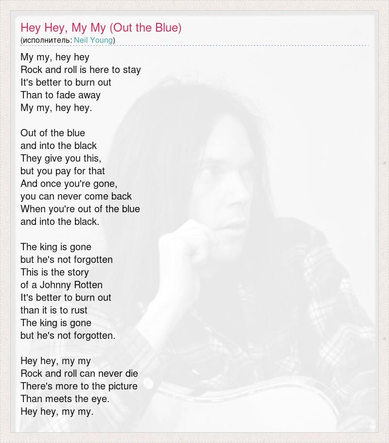 My my, hey hey Rock and roll is here to stay It's better to burn out Than to fade away My my, hey hey. Out of the blue and into the black They give you this, but you pay for that And once you're gone, you can never come back When you're out of the blue and into the black. The king is gone but he's not forgotten This is the story of a Johnny Rotten It's better to burn out than it is to rust The king is gone but he's not forgotten. Hey hey, my my Rock and roll can never die There's more to the picture Than meets the eye. Hey hey, my my.