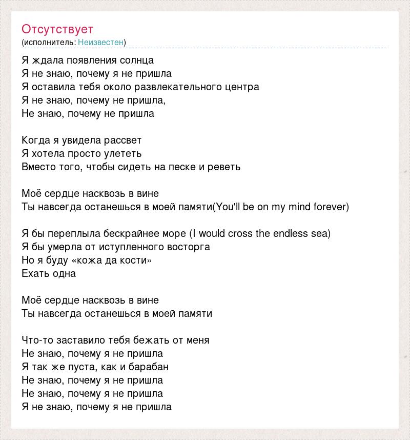 Я ждала появления солнца Я не знаю, почему я не пришла Я оставила тебя около развлекательного центра Я не знаю, почему не пришла, Не знаю, почему не пришла Когда я увидела рассвет Я хотела просто улететь Вместо того, чтобы сидеть на песке и реветь Моё сердце насквозь в вине Ты навсегда останешься в моей памяти(You'll be on my mind forever) Я бы переплыла бескрайнее море (I would cross the endless sea) Я бы умерла от иступленного восторга Но я буду «кожа да кости» Ехать одна Моё сердце насквозь в вине Ты навсегда останешься в моей памяти Что-то заставило тебя бежать от меня Не знаю, почему я не пришла Я так же пуста, как и барабан Не знаю, почему я не пришла Не знаю, почему я не пришла Я не знаю, почему я не пришла