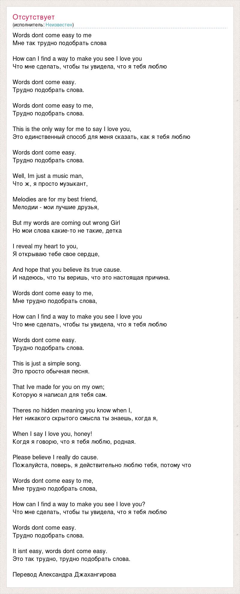 Words dont come easy to me Мне так трудно подобрать слова How can I find a way to make you see I love you Что мне сделать, чтобы ты увидела, что я тебя люблю Words dont come easy. Трудно подобрать слова. Words dont come easy to me, Трудно подобрать слова. This is the only way for me to say I love you, Это единственный способ для меня сказать, как я тебя люблю Words dont come easy. Трудно подобрать слова. Well, Im just a music man, Что ж, я просто музыкант, Melodies are for my best friend, Мелодии - мои лучшие друзья, But my words are coming out wrong Girl Но мои слова какие-то не такие, детка I reveal my heart to you, Я открываю тебе свое сердце, And hope that you believe its true cause. И надеюсь, что ты веришь, что это настоящая причина. Words dont come easy to me, Мне трудно подобрать слова, How can I find a way to make you see I love you Что мне сделать, чтобы ты увидела, что я тебя люблю Words dont come easy. Трудно подобрать слова. This is just a simple song. Это просто обычная песня. That Ive made for you on my own; Которую я написал для тебя сам. Theres no hidden meaning you know when I, Нет никакого скрытого смысла ты знаешь, когда я, When I say I love you, honey! Когдя я говорю, что я тебя люблю, родная. Please believe I really do cause. Пожалуйста, поверь, я действительно люблю тебя, потому что Words dont come easy to me, Мне трудно подобрать слова, How can I find a way to make you see I love you? Что мне сделать, чтобы ты увидела, что я тебя люблю Words dont come easy. Трудно подобрать слова. It isnt easy, words dont come easy. Это так трудно, трудно подобрать слова. Перевод Александра Джахангирова