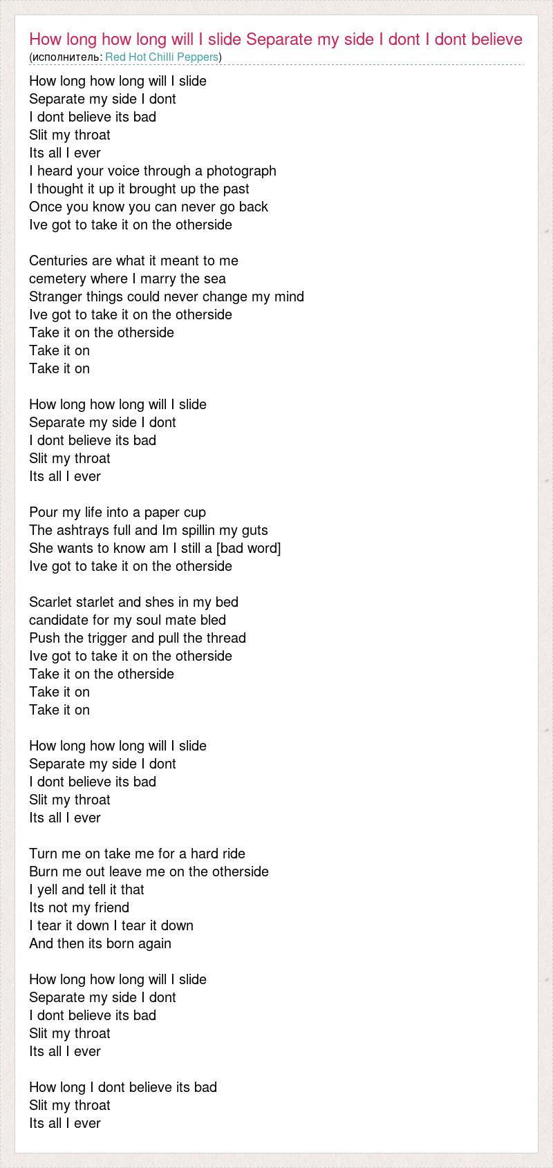 How long how long will I slide Separate my side I dont I dont believe its bad Slit my throat Its all I ever I heard your voice through a photograph I thought it up it brought up the past Once you know you can never go back Ive got to take it on the otherside Centuries are what it meant to me cemetery where I marry the sea Stranger things could never change my mind Ive got to take it on the otherside Take it on the otherside Take it on Take it on How long how long will I slide Separate my side I dont I dont believe its bad Slit my throat Its all I ever Pour my life into a paper cup The ashtrays full and Im spillin my guts She wants to know am I still a [bad word] Ive got to take it on the otherside Scarlet starlet and shes in my bed candidate for my soul mate bled Push the trigger and pull the thread Ive got to take it on the otherside Take it on the otherside Take it on Take it on How long how long will I slide Separate my side I dont I dont believe its bad Slit my throat Its all I ever Turn me on take me for a hard ride Burn me out leave me on the otherside I yell and tell it that Its not my friend I tear it down I tear it down And then its born again How long how long will I slide Separate my side I dont I dont believe its bad Slit my throat Its all I ever How long I dont believe its bad Slit my throat Its all I ever