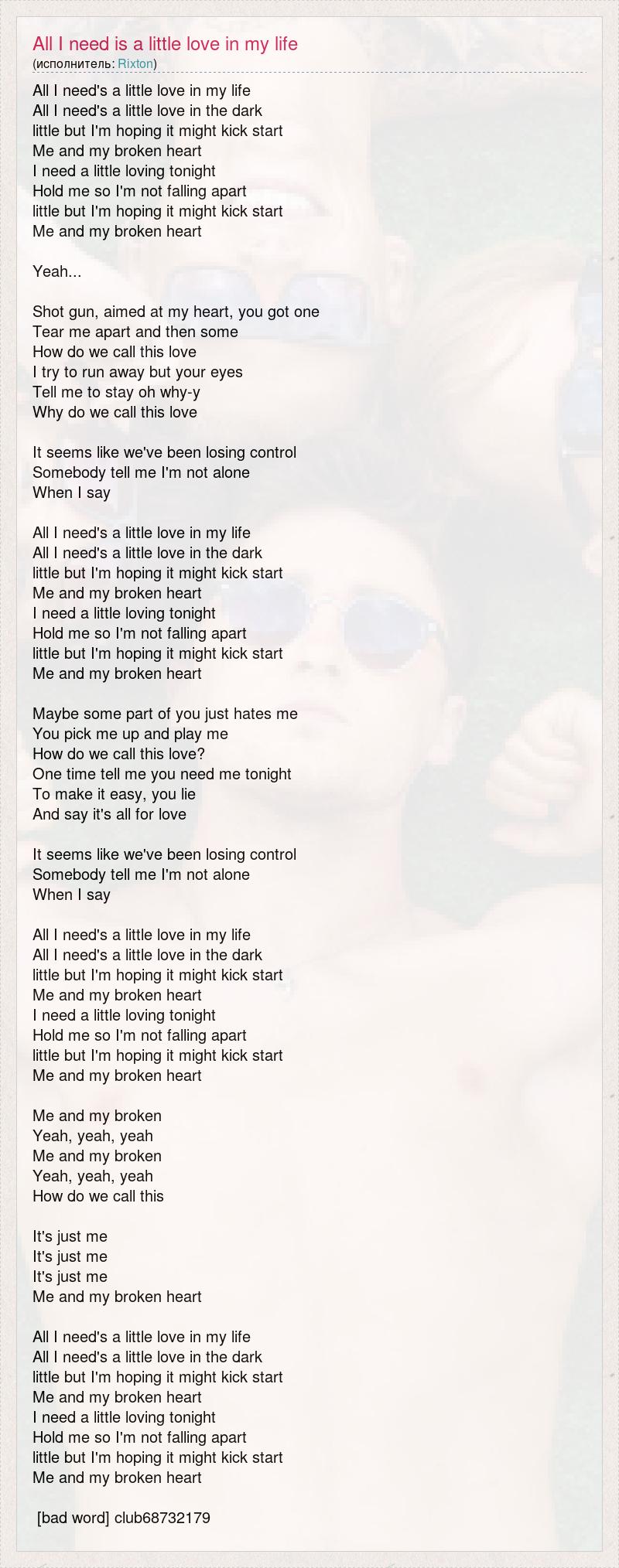 All I need's a little love in my life All I need's a little love in the dark little but I'm hoping it might kick start Me and my broken heart I need a little loving tonight Hold me so I'm not falling apart little but I'm hoping it might kick start Me and my broken heart Yeah... Shot gun, aimed at my heart, you got one Tear me apart and then some How do we call this love I try to run away but your eyes Tell me to stay oh why-y Why do we call this love It seems like we've been losing control Somebody tell me I'm not alone When I say All I need's a little love in my life All I need's a little love in the dark little but I'm hoping it might kick start Me and my broken heart I need a little loving tonight Hold me so I'm not falling apart little but I'm hoping it might kick start Me and my broken heart Maybe some part of you just hates me You pick me up and play me How do we call this love? One time tell me you need me tonight To make it easy, you lie And say it's all for love It seems like we've been losing control Somebody tell me I'm not alone When I say All I need's a little love in my life All I need's a little love in the dark little but I'm hoping it might kick start Me and my broken heart I need a little loving tonight Hold me so I'm not falling apart little but I'm hoping it might kick start Me and my broken heart Me and my broken Yeah, yeah, yeah Me and my broken Yeah, yeah, yeah How do we call this It's just me It's just me It's just me Me and my broken heart All I need's a little love in my life All I need's a little love in the dark little but I'm hoping it might kick start Me and my broken heart I need a little loving tonight Hold me so I'm not falling apart little but I'm hoping it might kick start Me and my broken heart [bad word] club68732179