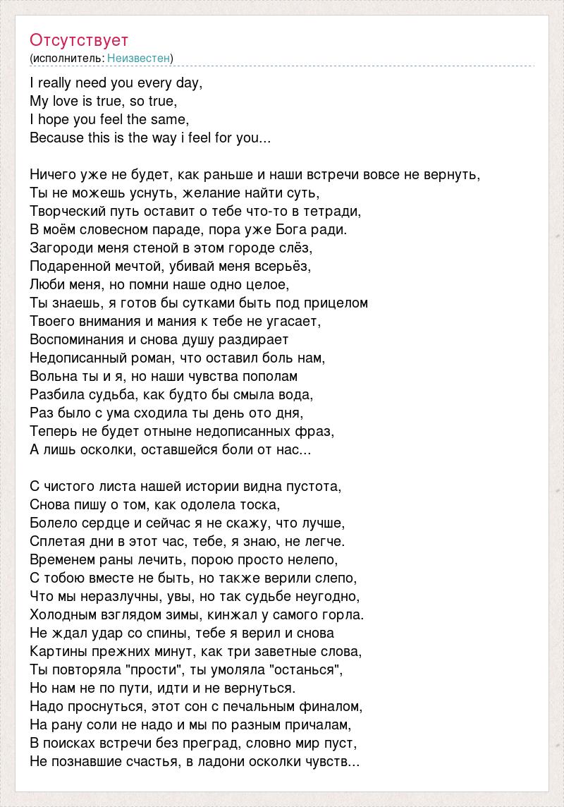 I really need you every day, My love is true, so true, I hope you feel the same, Because this is the way i feel for you... Ничего уже не будет, как раньше и наши встречи вовсе не вернуть, Ты не можешь уснуть, желание найти суть, Творческий путь оставит о тебе что-то в тетради, В моём словесном параде, пора уже Бога ради. Загороди меня стеной в этом городе слёз, Подаренной мечтой, убивай меня всерьёз, Люби меня, но помни наше одно целое, Ты знаешь, я готов бы сутками быть под прицелом Твоего внимания и мания к тебе не угасает, Воспоминания и снова душу раздирает Недописанный роман, что оставил боль нам, Вольна ты и я, но наши чувства пополам Разбила судьба, как будто бы смыла вода, Раз было с ума сходила ты день ото дня, Теперь не будет отныне недописанных фраз, А лишь осколки, оставшейся боли от нас... С чистого листа нашей истории видна пустота, Снова пишу о том, как одолела тоска, Болело сердце и сейчас я не скажу, что лучше, Сплетая дни в этот час, тебе, я знаю, не легче. Временем раны лечить, порою просто нелепо, С тобою вместе не быть, но также верили слепо, Что мы неразлучны, увы, но так судьбе неугодно, Холодным взглядом зимы, кинжал у самого горла. Не ждал удар со спины, тебе я верил и снова Картины прежних минут, как три заветные слова, Ты повторяла "прости", ты умоляла "останься", Но нам не по пути, идти и не вернуться. Надо проснуться, этот сон с печальным финалом, На рану соли не надо и мы по разным причалам, В поисках встречи без преград, словно мир пуст, Не познавшие счастья, в ладони осколки чувств...