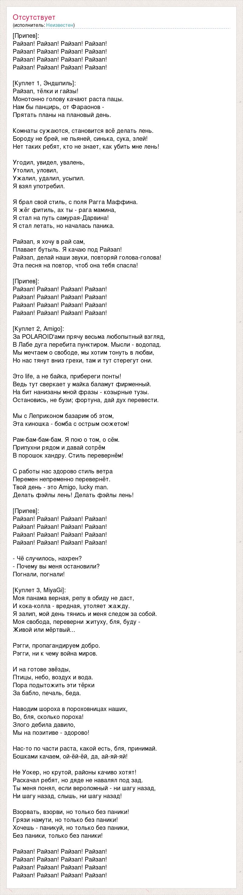 [Припев]: Райзап! Райзап! Райзап! Райзап! Райзап! Райзап! Райзап! Райзап! Райзап! Райзап! Райзап! Райзап! Райзап! Райзап! Райзап! Райзап! [Куплет 1, Эндшпиль]: Райзап, тёлки и гайзы! Монотонно голову качают раста пацы. Нам бы панцирь, от Фараонов - Прятать планы на плановый день. Комнаты сужаются, становится всё делать лень. Бороду не брей, не пьяней, синька, сука, злей! Нет таких ребят, кто не знает, как убить мне лень! Угодил, увидел, увалень, Утолил, уловил, Ужалил, удалил, усыпил. Я взял употребил. Я брал свой стиль, с поля Рагга Маффина. Я жёг фитиль, ах ты - рага мамина, Я стал на путь самурая-Дарвина! Я стал летать, но началась паника. Райзап, я хочу в рай сам, Плавает бутыль. Я качаю под Райзап! Райзап, делай наши звуки, повторяй голова-голова! Эта песня на повтор, чтоб она тебя спасла! [Припев]: Райзап! Райзап! Райзап! Райзап! Райзап! Райзап! Райзап! Райзап! Райзап! Райзап! Райзап! Райзап! Райзап! Райзап! Райзап! Райзап! [Куплет 2, Amigo]: За POLAROID'ами прячу весьма любопытный взгляд, В Лабе дуга перебита пунктиром. Мысли - водопад. Мы мечтаем о свободе, мы хотим тонуть в любви, Но нас тянут вниз грехи, там и тут стерегут они. Это life, а не байка, прибереги понты! Ведь тут сверкает у майка баламут фирменный. На бит нанизаны мной фразы - козырные тузы. Остановись, не бузи; фортуна, дай дух перевести. Мы с Леприконом базарим об этом, Эта киношка - бомба с острым сюжетом! Рам-бам-бам-бам. Я пою о том, о сём. Припухни рядом и давай сотрём В порошок хандру. Стиль перевернём! С работы нас здорово стиль ветра Перемен непременно перевернёт. Твой день - это Amigo, lucky man. Делать фэйлы лень! Делать фэйлы лень! [Припев]: Райзап! Райзап! Райзап! Райзап! Райзап! Райзап! Райзап! Райзап! Райзап! Райзап! Райзап! Райзап! Райзап! Райзап! Райзап! Райзап! - Чё случилось, нахрен? - Почему вы меня остановили? Погнали, погнали! [Куплет 3, MiyaGi]: Моя панама верная, репу в обиду не даст, И кока-колла - вредная, утоляет жажду. Я залип, мой день тянись и меня следом за собой. Моя свобода, переверни житуху, бля, буду - Живой или мёртвый... Рэгги, пропагандируем добро. Рэгги, ни к чему война миров. И на готове звёзды, Птицы, небо, воздух и вода. Пора подытожить эти тёрки За бабло, печаль, беда. Наводим шороха в пороховницах наших, Во, бля, сколько пороха! Злого дебила давило, Мы на позитиве - здорово! Нас-то по части раста, какой есть, бля, принимай. Бошками качаем, ой-ёй-ёй, да, ай-яй-яй! Не Уокер, но крутой, районы качиво хотят! Раскачал ребят, но дяде не навалял под зад. Ты меня понял, если вероломный - ни шагу назад, Ни шагу назад, слышь, ни шагу назад! Взорвать, взорви, но только без паники! Грязи намути, но только без паники! Хочешь - паникуй, но только без паники, Без паники, только без паники! Райзап! Райзап! Райзап! Райзап! Райзап! Райзап! Райзап! Райзап! Райзап! Райзап! Райзап! Райзап! Райзап! Райзап! Райзап! Райзап!