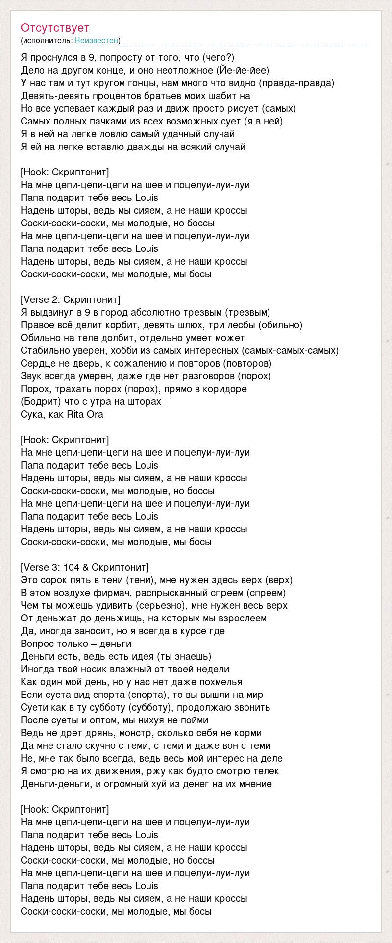 Я проснулся в 9, попросту от того, что (чего?) Дело на другом конце, и оно неотложное (Йе-йе-йее) У нас там и тут кругом гонцы, нам много что видно (правда-правда) Девять-девять процентов братьев моих шабит на Но все успевает каждый раз и движ просто рисует (самых) Самых полных пачками из всех возможных сует (я в ней) Я в ней на легке ловлю самый удачный случай Я ей на легке вставлю дважды на всякий случай [Hook: Скриптонит] На мне цепи-цепи-цепи на шее и поцелуи-луи-луи Папа подарит тебе весь Louis Надень шторы, ведь мы сияем, а не наши кроссы Соски-соски-соски, мы молодые, но боссы На мне цепи-цепи-цепи на шее и поцелуи-луи-луи Папа подарит тебе весь Louis Надень шторы, ведь мы сияем, а не наши кроссы Соски-соски-соски, мы молодые, мы босы [Verse 2: Скриптонит] Я выдвинул в 9 в город абсолютно трезвым (трезвым) Правое всё делит корбит, девять шлюх, три лесбы (обильно) Обильно на теле долбит, отдельно умеет может Стабильно уверен, хобби из самых интересных (самых-самых-самых) Сердце не дверь, к сожалению и повторов (повторов) Звук всегда умерен, даже где нет разговоров (порох) Порох, трахать порох (порох), прямо в коридоре (Бодрит) что с утра на шторах Сука, как Rita Ora [Hook: Скриптонит] На мне цепи-цепи-цепи на шее и поцелуи-луи-луи Папа подарит тебе весь Louis Надень шторы, ведь мы сияем, а не наши кроссы Соски-соски-соски, мы молодые, но боссы На мне цепи-цепи-цепи на шее и поцелуи-луи-луи Папа подарит тебе весь Louis Надень шторы, ведь мы сияем, а не наши кроссы Соски-соски-соски, мы молодые, мы босы [Verse 3: 104 & Скриптонит] Это сорок пять в тени (тени), мне нужен здесь верх (верх) В этом воздухе фирмач, распрысканный спреем (спреем) Чем ты можешь удивить (серьезно), мне нужен весь верх От деньжат до деньжищь, на которых мы взрослеем Да, иногда заносит, но я всегда в курсе где Вопрос только – деньги Деньги есть, ведь есть идея (ты знаешь) Иногда твой носик влажный от твоей недели Как один мой день, но у нас нет даже похмелья Если суета вид спорта (спорта), то вы вышли на мир Суети как в ту субботу (субботу), продолжаю звонить После суеты и оптом, мы нихуя не пойми Ведь не дрет дрянь, монстр, сколько себя не корми Да мне стало скучно с теми, с теми и даже вон с теми Не, мне так было всегда, ведь весь мой интерес на деле Я смотрю на их движения, ржу как будто смотрю телек Деньги-деньги, и огромный хуй из денег на их мнение [Hook: Скриптонит] На мне цепи-цепи-цепи на шее и поцелуи-луи-луи Папа подарит тебе весь Louis Надень шторы, ведь мы сияем, а не наши кроссы Соски-соски-соски, мы молодые, но боссы На мне цепи-цепи-цепи на шее и поцелуи-луи-луи Папа подарит тебе весь Louis Надень шторы, ведь мы сияем, а не наши кроссы Соски-соски-соски, мы молодые, мы босы