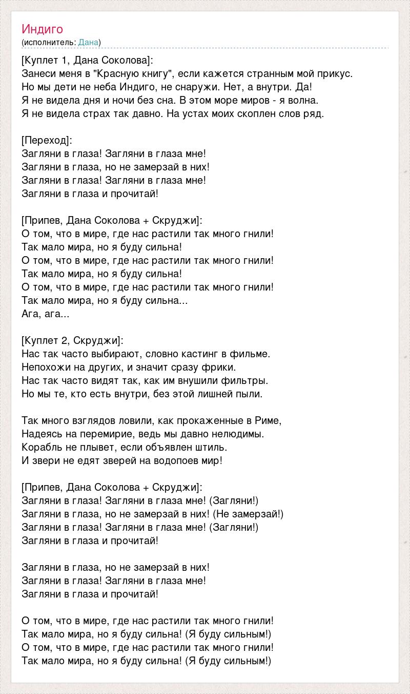 [Куплет 1, Дана Соколова]: Занеси меня в "Красную книгу", если кажется странным мой прикус. Но мы дети не неба Индиго, не снаружи. Нет, а внутри. Да! Я не видела дня и ночи без сна. В этом море миров - я волна. Я не видела страх так давно. На устах моих скоплен слов ряд. [Переход]: Загляни в глаза! Загляни в глаза мне! Загляни в глаза, но не замерзай в них! Загляни в глаза! Загляни в глаза мне! Загляни в глаза и прочитай! [Припев, Дана Соколова + Скруджи]: О том, что в мире, где нас растили так много гнили! Так мало мира, но я буду сильна! О том, что в мире, где нас растили так много гнили! Так мало мира, но я буду сильна! О том, что в мире, где нас растили так много гнили! Так мало мира, но я буду сильна... Ага, ага... [Куплет 2, Скруджи]: Нас так часто выбирают, словно кастинг в фильме. Непохожи на других, и значит сразу фрики. Нас так часто видят так, как им внушили фильтры. Но мы те, кто есть внутри, без этой лишней пыли. Так много взглядов ловили, как прокаженные в Риме, Надеясь на перемирие, ведь мы давно нелюдимы. Корабль не плывет, если объявлен штиль. И звери не едят зверей на водопоев мир! [Припев, Дана Соколова + Скруджи]: Загляни в глаза! Загляни в глаза мне! (Загляни!) Загляни в глаза, но не замерзай в них! (Не замерзай!) Загляни в глаза! Загляни в глаза мне! (Загляни!) Загляни в глаза и прочитай! Загляни в глаза, но не замерзай в них! Загляни в глаза! Загляни в глаза мне! Загляни в глаза и прочитай! О том, что в мире, где нас растили так много гнили! Так мало мира, но я буду сильна! (Я буду сильным!) О том, что в мире, где нас растили так много гнили! Так мало мира, но я буду сильна! (Я буду сильным!)