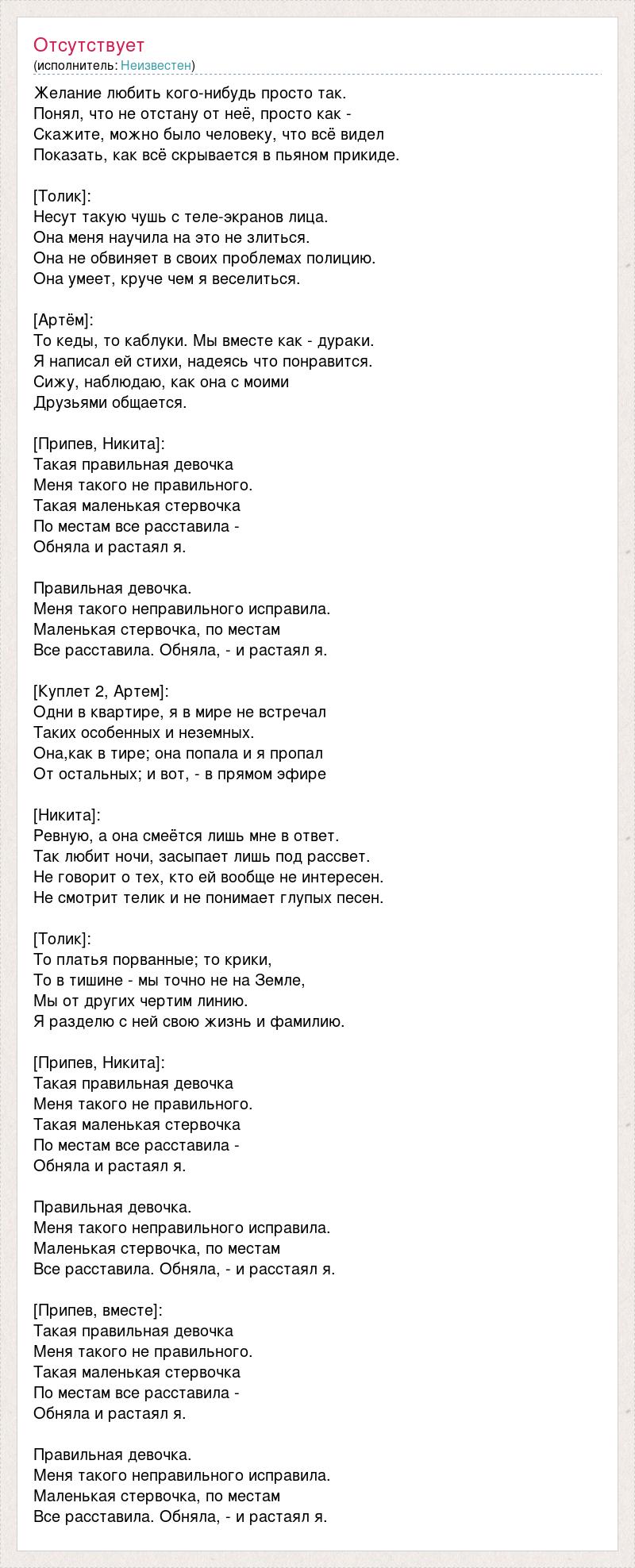Желание любить кого-нибудь просто так. Понял, что не отстану от неё, просто как - Скажите, можно было человеку, что всё видел Показать, как всё скрывается в пьяном прикиде. [Толик]: Несут такую чушь с теле-экранов лица. Она меня научила на это не злиться. Она не обвиняет в своих проблемах полицию. Она умеет, круче чем я веселиться. [Артём]: То кеды, то каблуки. Мы вместе как - дураки. Я написал ей стихи, надеясь что понравится. Сижу, наблюдаю, как она с моими Друзьями общается. [Припев, Никита]: Такая правильная девочка Меня такого не правильного. Такая маленькая стервочка По местам все расставила - Обняла и растаял я. Правильная девочка. Меня такого неправильного исправила. Маленькая стервочка, по местам Все расставила. Обняла, - и растаял я. [Куплет 2, Артем]: Одни в квартире, я в мире не встречал Таких особенных и неземных. Она,как в тире; она попала и я пропал От остальных; и вот, - в прямом эфире [Никита]: Ревную, а она смеётся лишь мне в ответ. Так любит ночи, засыпает лишь под рассвет. Не говорит о тех, кто ей вообще не интересен. Не смотрит телик и не понимает глупых песен. [Толик]: То платья порванные; то крики, То в тишине - мы точно не на Земле, Мы от других чертим линию. Я разделю с ней свою жизнь и фамилию. [Припев, Никита]: Такая правильная девочка Меня такого не правильного. Такая маленькая стервочка По местам все расставила - Обняла и растаял я. Правильная девочка. Меня такого неправильного исправила. Маленькая стервочка, по местам Все расставила. Обняла, - и расстаял я. [Припев, вместе]: Такая правильная девочка Меня такого не правильного. Такая маленькая стервочка По местам все расставила - Обняла и растаял я. Правильная девочка. Меня такого неправильного исправила. Маленькая стервочка, по местам Все расставила. Обняла, - и растаял я.