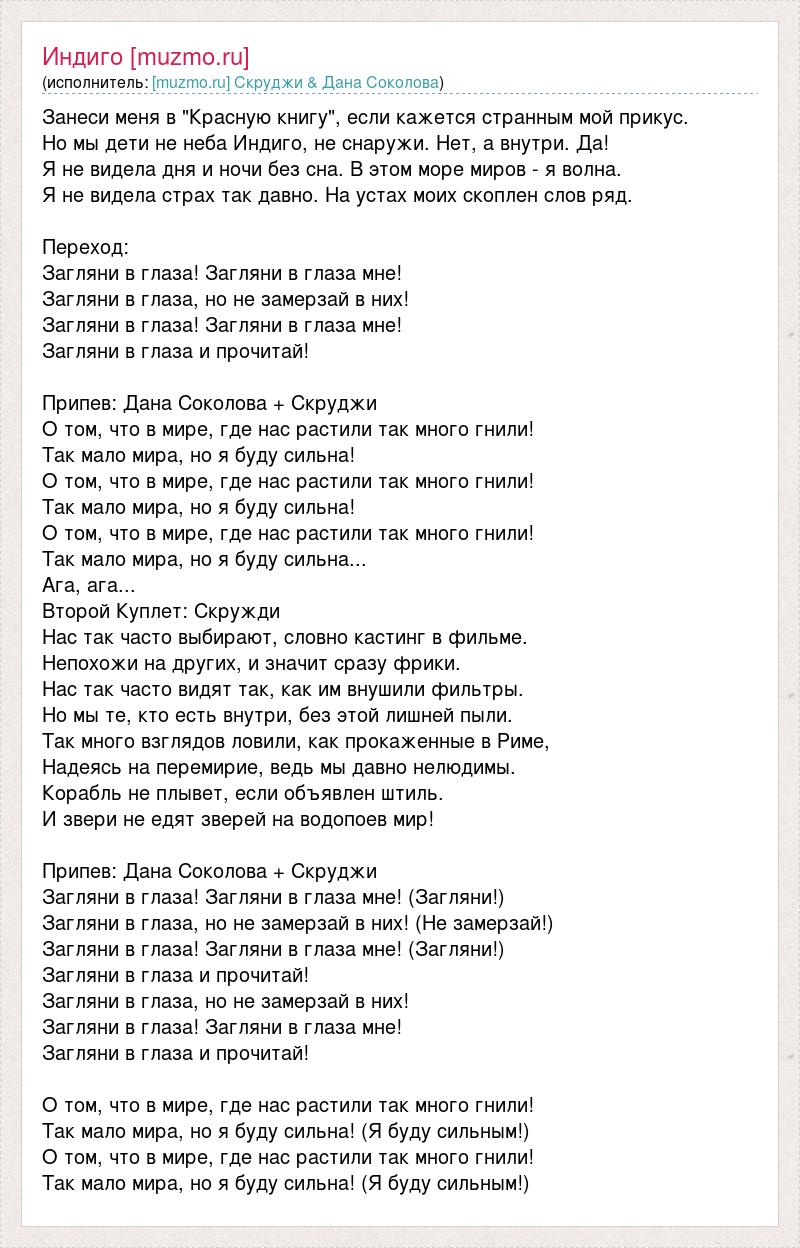 Занеси меня в "Красную книгу", если кажется странным мой прикус. Но мы дети не неба Индиго, не снаружи. Нет, а внутри. Да! Я не видела дня и ночи без сна. В этом море миров - я волна. Я не видела страх так давно. На устах моих скоплен слов ряд. Переход: Загляни в глаза! Загляни в глаза мне! Загляни в глаза, но не замерзай в них! Загляни в глаза! Загляни в глаза мне! Загляни в глаза и прочитай! Припев: Дана Соколова + Скруджи О том, что в мире, где нас растили так много гнили! Так мало мира, но я буду сильна! О том, что в мире, где нас растили так много гнили! Так мало мира, но я буду сильна! О том, что в мире, где нас растили так много гнили! Так мало мира, но я буду сильна... Ага, ага... Второй Куплет: Скружди Нас так часто выбирают, словно кастинг в фильме. Непохожи на других, и значит сразу фрики. Нас так часто видят так, как им внушили фильтры. Но мы те, кто есть внутри, без этой лишней пыли. Так много взглядов ловили, как прокаженные в Риме, Надеясь на перемирие, ведь мы давно нелюдимы. Корабль не плывет, если объявлен штиль. И звери не едят зверей на водопоев мир! Припев: Дана Соколова + Скруджи Загляни в глаза! Загляни в глаза мне! (Загляни!) Загляни в глаза, но не замерзай в них! (Не замерзай!) Загляни в глаза! Загляни в глаза мне! (Загляни!) Загляни в глаза и прочитай! Загляни в глаза, но не замерзай в них! Загляни в глаза! Загляни в глаза мне! Загляни в глаза и прочитай! О том, что в мире, где нас растили так много гнили! Так мало мира, но я буду сильна! (Я буду сильным!) О том, что в мире, где нас растили так много гнили! Так мало мира, но я буду сильна! (Я буду сильным!)