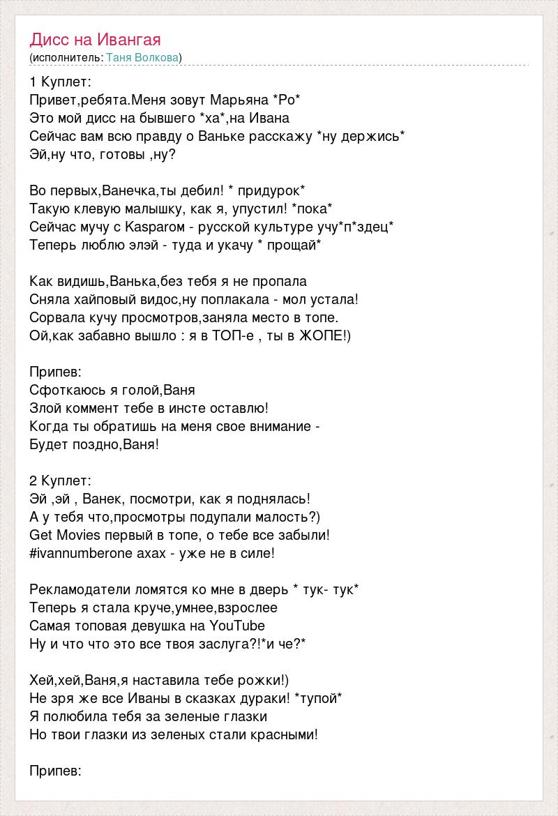 1 Куплет: Привет,ребята.Меня зовут Марьяна *Ро* Это мой дисс на бывшего *ха*,на Ивана Сейчас вам всю правду о Ваньке расскажу *ну держись* Эй,ну что, готовы ,ну? Во первых,Ванечка,ты дебил! * придурок* Такую клевую малышку, как я, упустил! *пока* Сейчас мучу с Kasparом - русской культуре учу*п*здец* Теперь люблю элэй - туда и укачу * прощай* Как видишь,Ванька,без тебя я не пропала Сняла хайповый видос,ну поплакала - мол устала! Сорвала кучу просмотров,заняла место в топе. Ой,как забавно вышло : я в ТОП-е , ты в ЖОПЕ!) Припев: Сфоткаюсь я голой,Ваня Злой коммент тебе в инсте оставлю! Когда ты обратишь на меня свое внимание - Будет поздно,Ваня! 2 Куплет: Эй ,эй , Ванек, посмотри, как я поднялась! А у тебя что,просмотры подупали малость?) Get Movies первый в топе, о тебе все забыли! #ivannumberone ахах - уже не в силе! Рекламодатели ломятся ко мне в дверь * тук- тук* Теперь я стала круче,умнее,взрослее Самая топовая девушка на YouTube Ну и что что это все твоя заслуга?!*и че?* Хей,хей,Ваня,я наставила тебе рожки!) Не зря же все Иваны в сказках дураки! *тупой* Я полюбила тебя за зеленые глазки Но твои глазки из зеленых стали красными! Припев: