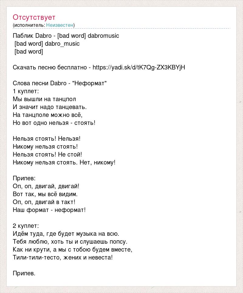 Паблик Dabro - [bad word] dabromusic [bad word] dabro_music [bad word] Скачать песню бесплатно - https://yadi.sk/d/tK7Qg-ZX3KBYjH Слова песни Dabro - "Неформат" 1 куплет: Мы вышли на танцпол И значит надо танцевать. На танцполе можно всё, Но вот одно нельзя - стоять! Нельзя стоять! Нельзя! Никому нельзя стоять! Нельзя стоять! Не стой! Никому нельзя стоять. Нет, никому! Припев: Оп, оп, двигай, двигай! Вот так, мы всё видим. Оп, оп, двигай в такт! Наш формат - неформат! 2 куплет: Идём туда, где будет музыка на всю. Тебя люблю, хоть ты и слушаешь попсу. Как ни крути, а мы с тобою будем вместе, Тили-тили-тесто, жених и невеста! Припев.