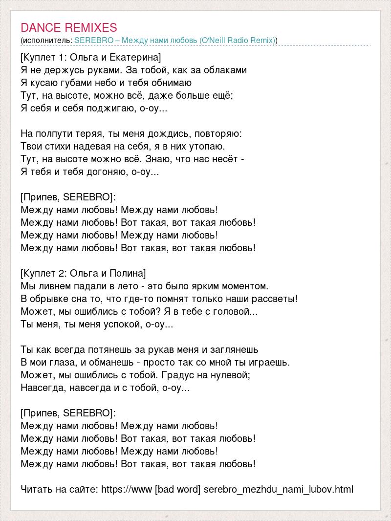 [Куплет 1: Ольга и Екатерина] Я не держусь руками. За тобой, как за облаками Я кусаю губами небо и тебя обнимаю Тут, на высоте, можно всё, даже больше ещё; Я себя и себя поджигаю, о-оу... На полпути теряя, ты меня дождись, повторяю: Твои стихи надевая на себя, я в них утопаю. Тут, на высоте можно всё. Знаю, что нас несёт - Я тебя и тебя догоняю, о-оу... [Припев, SEREBRO]: Между нами любовь! Между нами любовь! Между нами любовь! Вот такая, вот такая любовь! Между нами любовь! Между нами любовь! Между нами любовь! Вот такая, вот такая любовь! [Куплет 2: Ольга и Полина] Мы ливнем падали в лето - это было ярким моментом. В обрывке сна то, что где-то помнят только наши рассветы! Может, мы ошиблись с тобой? Я в тебе с головой... Ты меня, ты меня успокой, о-оу... Ты как всегда потянешь за рукав меня и заглянешь В мои глаза, и обманешь - просто так со мной ты играешь. Может, мы ошиблись с тобой. Градус на нулевой; Навсегда, навсегда и с тобой, о-оу... [Припев, SEREBRO]: Между нами любовь! Между нами любовь! Между нами любовь! Вот такая, вот такая любовь! Между нами любовь! Между нами любовь! Между нами любовь! Вот такая, вот такая любовь! Читать на сайте: https://www [bad word] serebro_mezhdu_nami_lubov.html
