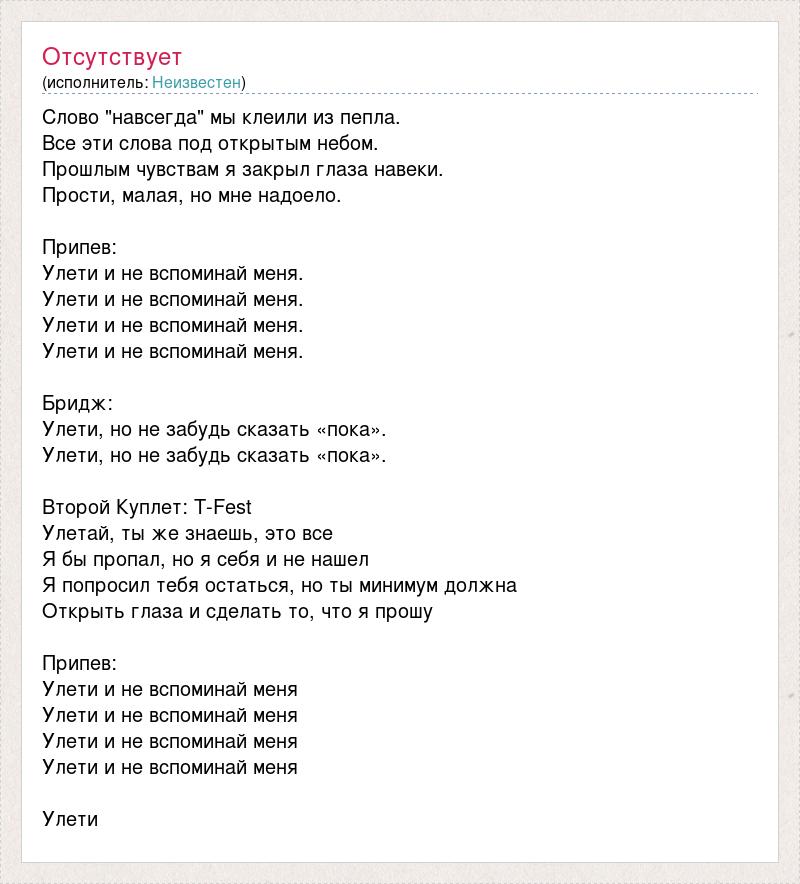 Слово "навсегда" мы клеили из пепла. Все эти слова под открытым небом. Прошлым чувствам я закрыл глаза навеки. Прости, малая, но мне надоело. Припев: Улети и не вспоминай меня. Улети и не вспоминай меня. Улети и не вспоминай меня. Улети и не вспоминай меня. Бридж: Улети, но не забудь сказать «пока». Улети, но не забудь сказать «пока». Второй Куплет: T-Fest Улетай, ты же знаешь, это все Я бы пропал, но я себя и не нашел Я попросил тебя остаться, но ты минимум должна Открыть глаза и сделать то, что я прошу Припев: Улети и не вспоминай меня Улети и не вспоминай меня Улети и не вспоминай меня Улети и не вспоминай меня Улети