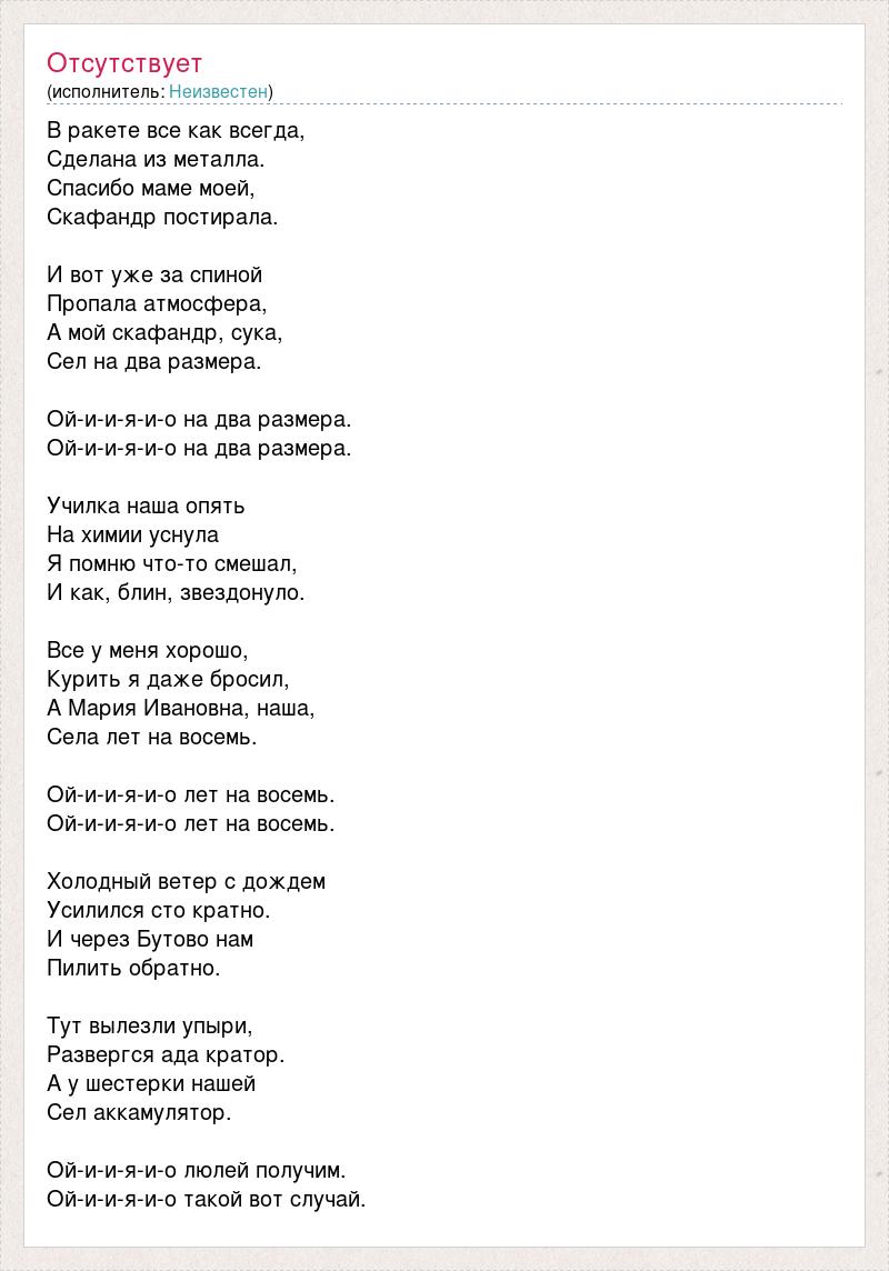 В ракете все как всегда, Сделана из металла. Спасибо маме моей, Скафандр постирала. И вот уже за спиной Пропала атмосфера, А мой скафандр, сука, Сел на два размера. Ой-и-и-я-и-о на два размера. Ой-и-и-я-и-о на два размера. Училка наша опять На химии уснула Я помню что-то смешал, И как, блин, звездонуло. Все у меня хорошо, Курить я даже бросил, А Мария Ивановна, наша, Села лет на восемь. Ой-и-и-я-и-о лет на восемь. Ой-и-и-я-и-о лет на восемь. Холодный ветер с дождем Усилился сто кратно. И через Бутово нам Пилить обратно. Тут вылезли упыри, Развергся ада кратор. А у шестерки нашей Сел аккамулятор. Ой-и-и-я-и-о люлей получим. Ой-и-и-я-и-о такой вот случай.