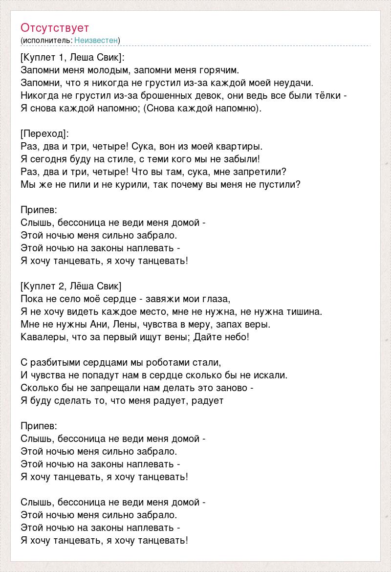 [Куплет 1, Леша Свик]: Запомни меня молодым, запомни меня горячим. Запомни, что я никогда не грустил из-за каждой моей неудачи. Никогда не грустил из-за брошенных девок, они ведь все были тёлки - Я снова каждой напомню; (Снова каждой напомню). [Переход]: Раз, два и три, четыре! Сука, вон из моей квартиры. Я сегодня буду на стиле, с теми кого мы не забыли! Раз, два и три, четыре! Что вы там, сука, мне запретили? Мы же не пили и не курили, так почему вы меня не пустили? Припев: Слышь, бессоница не веди меня домой - Этой ночью меня сильно забрало. Этой ночью на законы наплевать - Я хочу танцевать, я хочу танцевать! [Куплет 2, Лёша Свик] Пока не село моё сердце - завяжи мои глаза, Я не хочу видеть каждое место, мне не нужна, не нужна тишина. Мне не нужны Ани, Лены, чувства в меру, запах веры. Кавалеры, что за первый ищут вены; Дайте небо! С разбитыми сердцами мы роботами стали, И чувства не попадут нам в сердце сколько бы не искали. Сколько бы не запрещали нам делать это заново - Я буду сделать то, что меня радует, радует Припев: Слышь, бессоница не веди меня домой - Этой ночью меня сильно забрало. Этой ночью на законы наплевать - Я хочу танцевать, я хочу танцевать! Слышь, бессоница не веди меня домой - Этой ночью меня сильно забрало. Этой ночью на законы наплевать - Я хочу танцевать, я хочу танцевать!