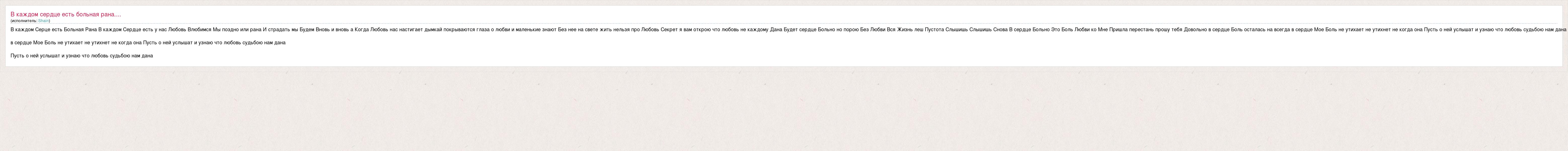 В каждом Серце есть Больная Рана В каждом Сердце есть у нас Любовь Влюбимся Мы поздно или рана И страдать мы Будем Вновь и вновь а Когда Любовь нас настигает дымкай покрываются глаза о любви и маленькие знают Без нее на свете жить нельзя про Любовь Секрет я вам открою что любовь не каждому Дана Будет сердце Больно но порою Без Любви Вся Жизнь леш Пустота Слышишь Слышишь Снова В сердце Больно Это Боль Любви ко Мне Пришла перестань прошу тебя Довольно в сердце Боль осталась на всегда в сердце Мое Боль не утихает не утихнет не когда она Пусть о ней услышат и узнаю что любовь судьбою нам дана в сердце Мое Боль не утихает не утихнет не когда она Пусть о ней услышат и узнаю что любовь судьбою нам дана Пусть о ней услышат и узнаю что любовь судьбою нам дана