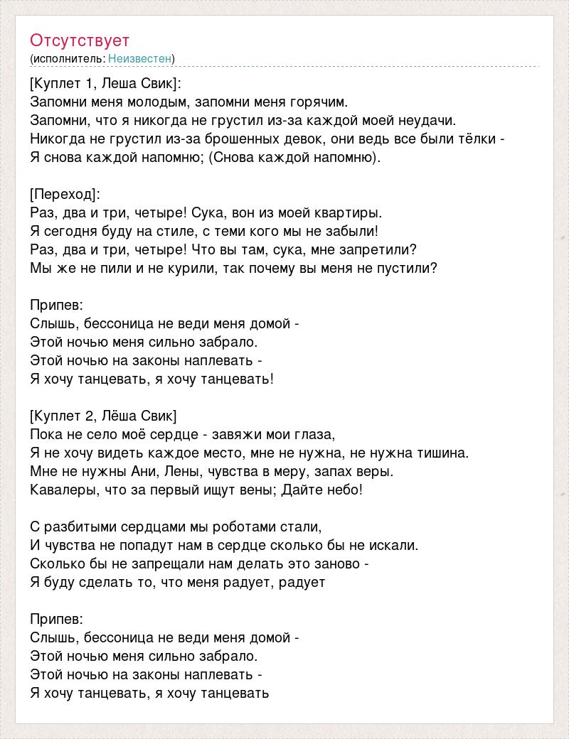 [Куплет 1, Леша Свик]: Запомни меня молодым, запомни меня горячим. Запомни, что я никогда не грустил из-за каждой моей неудачи. Никогда не грустил из-за брошенных девок, они ведь все были тёлки - Я снова каждой напомню; (Снова каждой напомню). [Переход]: Раз, два и три, четыре! Сука, вон из моей квартиры. Я сегодня буду на стиле, с теми кого мы не забыли! Раз, два и три, четыре! Что вы там, сука, мне запретили? Мы же не пили и не курили, так почему вы меня не пустили? Припев: Слышь, бессоница не веди меня домой - Этой ночью меня сильно забрало. Этой ночью на законы наплевать - Я хочу танцевать, я хочу танцевать! [Куплет 2, Лёша Свик] Пока не село моё сердце - завяжи мои глаза, Я не хочу видеть каждое место, мне не нужна, не нужна тишина. Мне не нужны Ани, Лены, чувства в меру, запах веры. Кавалеры, что за первый ищут вены; Дайте небо! С разбитыми сердцами мы роботами стали, И чувства не попадут нам в сердце сколько бы не искали. Сколько бы не запрещали нам делать это заново - Я буду сделать то, что меня радует, радует Припев: Слышь, бессоница не веди меня домой - Этой ночью меня сильно забрало. Этой ночью на законы наплевать - Я хочу танцевать, я хочу танцевать