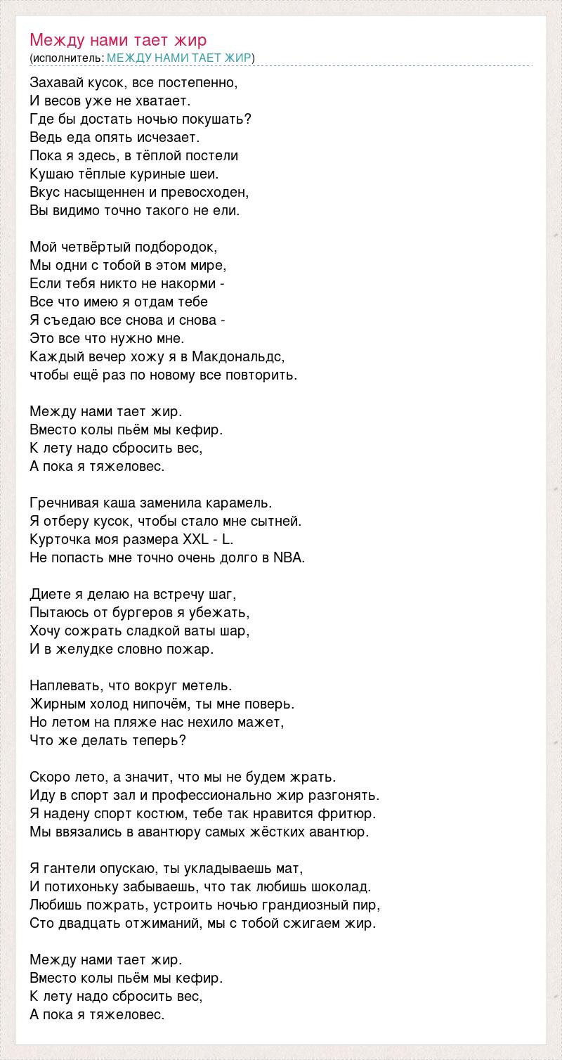 Захавай кусок, все постепенно, И весов уже не хватает. Где бы достать ночью покушать? Ведь еда опять исчезает. Пока я здесь, в тёплой постели Кушаю тёплые куриные шеи. Вкус насыщеннен и превосходен, Вы видимо точно такого не ели. Мой четвёртый подбородок, Мы одни с тобой в этом мире, Если тебя никто не накорми - Все что имею я отдам тебе Я съедаю все снова и снова - Это все что нужно мне. Каждый вечер хожу я в Макдональдс, чтобы ещё раз по новому все повторить. Между нами тает жир. Вместо колы пьём мы кефир. К лету надо сбросить вес, А пока я тяжеловес. Гречнивая каша заменила карамель. Я отберу кусок, чтобы стало мне сытней. Курточка моя размера ХХL - L. Не попасть мне точно очень долго в NBA. Диете я делаю на встречу шаг, Пытаюсь от бургеров я убежать, Хочу сожрать сладкой ваты шар, И в желудке словно пожар. Наплевать, что вокруг метель. Жирным холод нипочём, ты мне поверь. Но летом на пляже нас нехило мажет, Что же делать теперь? Скоро лето, а значит, что мы не будем жрать. Иду в спорт зал и профессионально жир разгонять. Я надену спорт костюм, тебе так нравится фритюр. Мы ввязались в авантюру самых жёстких авантюр. Я гантели опускаю, ты укладываешь мат, И потихоньку забываешь, что так любишь шоколад. Любишь пожрать, устроить ночью грандиозный пир, Сто двадцать отжиманий, мы с тобой сжигаем жир. Между нами тает жир. Вместо колы пьём мы кефир. К лету надо сбросить вес, А пока я тяжеловес.