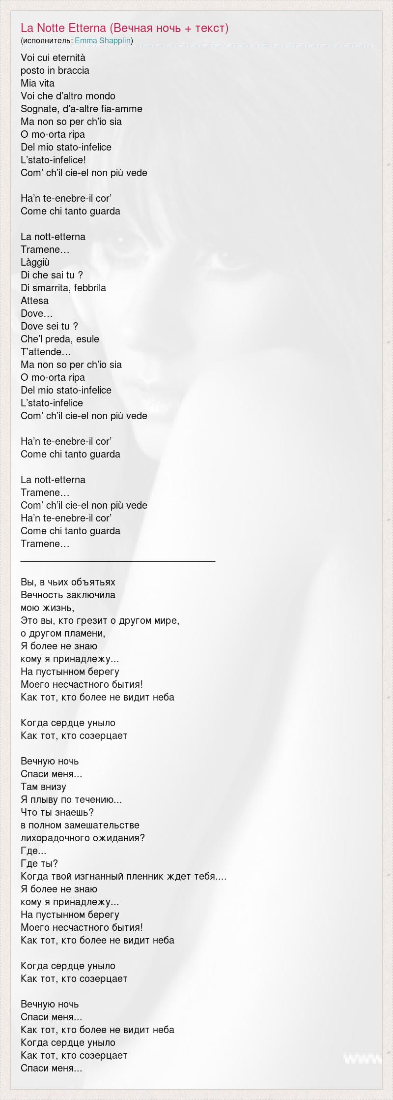 Voi cui eternità posto in braccia Mia vita Voi che d’altro mondo Sognate, d’a-altre fia-amme Ma non so per ch’io sia O mo-orta ripa Del mio stato-infelice L’stato-infelice! Com’ ch’il cie-el non più vede Ha’n te-enebre-il cor’ Come chi tanto guarda La nott-etterna Tramene… Làggiù Di che sai tu ? Di smarrita, febbrila Attesa Dove… Dove sei tu ? Che’l preda, esule T’attende… Ma non so per ch’io sia O mo-orta ripa Del mio stato-infelice L’stato-infelice Com’ ch’il cie-el non più vede Ha’n te-enebre-il cor’ Come chi tanto guarda La nott-etterna Tramene… Com’ ch’il cie-el non più vede Ha’n te-enebre-il cor’ Come chi tanto guarda Tramene… ____________________________________ Вы, в чьих объятьях Вечность заключила мою жизнь, Это вы, кто грезит о другом мире, о другом пламени, Я более не знаю кому я принадлежу... На пустынном берегу Моего несчастного бытия! Как тот, кто более не видит неба Когда сердце уныло Как тот, кто созерцает Вечную ночь Спаси меня... Там внизу Я плыву по течению... Что ты знаешь? в полном замешательстве лихорадочного ожидания? Где... Где ты? Когда твой изгнанный пленник ждет тебя.... Я более не знаю кому я принадлежу... На пустынном берегу Моего несчастного бытия! Как тот, кто более не видит неба Когда сердце уныло Как тот, кто созерцает Вечную ночь Спаси меня... Как тот, кто более не видит неба Когда сердце уныло Как тот, кто созерцает Спаси меня...