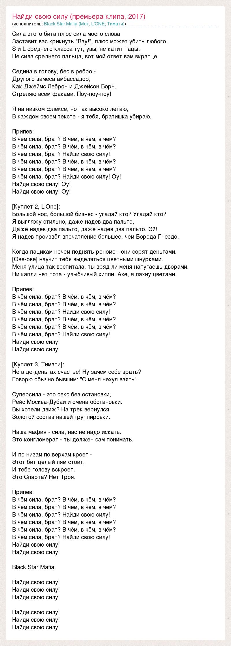 Сила этого бита плюс сила моего слова Заставит вас крикнуть "Вау!", плюс может убить любого. S и L среднего класса тут, увы, не катит пацы. Не сила среднего пальца, вот мой ответ вам вкратце. Седина в голову, бес в ребро - Другого замеса амбассадор, Как Джеймс Леброн и Джейсон Борн. Стреляю всем факами. Поу-поу-поу! Я на низком флексе, но так высоко летаю, В каждом своем тексте - я тебя, братишка убираю. Припев: В чём сила, брат? В чём, в чём, в чём? В чём сила, брат? В чём, в чём, в чём? В чём сила, брат? Найди свою силу! В чём сила, брат? В чём, в чём, в чём? В чём сила, брат? В чём, в чём, в чём? В чём сила, брат? Найди свою силу! Оу! Найди свою силу! Оу! Найди свою силу! Оу! [Куплет 2, L'One]: Большой нос, большой бизнес - угадай кто? Угадай кто? Я выгляжу стильно, даже надев два пальто, Даже надев два пальто, даже надев два пальто. Эй! Я надев произвёл впечатление большее, чем Борода Гнездо. Когда пацикам нечем поднять реноме - они сорят деньгами. [Ове-ове] научит тебя выделяться цветными шнурками. Меня улица так воспитала, ты вряд ли меня напугаешь дворами. Ни капли нет пота - улыбчивый хиппи, Axe, я пахну цветами. Припев: В чём сила, брат? В чём, в чём, в чём? В чём сила, брат? В чём, в чём, в чём? В чём сила, брат? Найди свою силу! В чём сила, брат? В чём, в чём, в чём? В чём сила, брат? В чём, в чём, в чём? В чём сила, брат? Найди свою силу! Найди свою силу! Найди свою силу! [Куплет 3, Тимати]: Не в де-деньгах счастье! Ну зачем себе врать? Говорю обычно бывшим: "С меня нехуя взять". Суперсила - это секс без остановки, Рейс Москва-Дубаи и смена обстановки. Вы хотели движ? На трек вернулся Золотой состав нашей группировки. Наша мафия - сила, нас не надо искать. Это конгломерат - ты должен сам понимать. И по низам по верхам кроет - Этот бит целый лям стоит, И тебе голову вскроет. Это Спарта? Нет Троя. Припев: В чём сила, брат? В чём, в чём, в чём? В чём сила, брат? В чём, в чём, в чём? В чём сила, брат? Найди свою силу! В чём сила, брат? В чём, в чём, в чём? В чём сила, брат? В чём, в чём, в чём? В чём сила, брат? Найди свою силу! Найди свою силу! Найди свою силу! Black Star Mafia. Найди свою силу! Найди свою силу! Найди свою силу! Найди свою силу! Найди свою силу! Найди свою силу!
