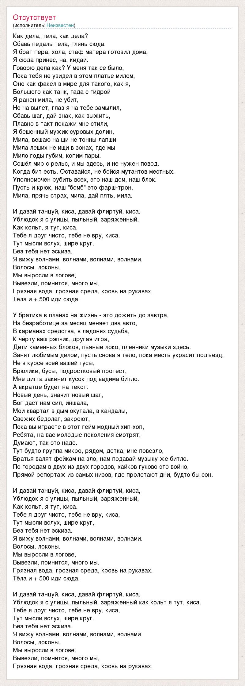 Как дела, тела, как дела? Сбавь педаль тела, глянь сюда. Я брат пера, хола, стаф матера готовил дома, Я сюда принес, на, кидай. Говорю дела как? У меня так се было, Пока тебя не увидел в этом платье милом, Оно как факел в мире для такого, как я, Большого как танк, гада с гидрой Я ранен мила, не убит, Но на вылет, глаз я на тебе замылил, Сбавь шаг, дай знак, как выжить, Плавно в такт покажи мне стили, Я бешенный мужик суровых долин, Мила, вешаю на щи не тонны лапши Мила леших не ищи в зонах, где мы Мило годы губим, копим пары. Сошёл мир с рельс, и мы здесь, и не нужен повод. Когда бит есть. Оставайся, не бойся мутантов местных. Уполномочен рубить всех, это наш дом, наш блок. Пусть и крюк, наш "бомб" это фарш-трон. Мила, прячь страх, мила, дай пять, мила. И давай танцуй, киса, давай флиртуй, киса. Ублюдок я с улицы, пыльный, заряженный. Как кольт, я тут, киса. Тебе я друг чисто, тебе не вру, киса. Тут мысли вслух, шире круг. Без тебя нет эскиза. Я вижу волнами, волнами, волнами, волнами, Волосы. локоны. Мы выросли в логове, Вывезли, помнится, много мы, Грязная вода, грозная среда, кровь на рукавах, Тёла и + 500 иди сюда. У братика в планах на жизнь - это дожить до завтра, На безработице за месяц меняет два авто, В карманах средства, в ладонях судьба, К чёрту ваш рэпчик, другая игра, Дети каменных блоков, пьяные локо, пленники музыки здесь. Занят любимым делом, пусть снова я тело, пока месть украсит подъезд. Не в курсе всей вашей тусы, Брюлики, бусы, подростковый протест, Мне дигга закинет кусок под вадима битло. А вкратце будет на текст. Новый день, значит новый шаг, Бог даст нам сил, иншала, Мой квартал в дым окутала, в кандалы, Свежих бедолаг, закроют, Пока вы играете в этот гейм модный хип-хоп, Ребята, на вас молодые поколения смотрят, Думают, так это надо. Тут будто группа микро, рядом, детка, мне повезло, Братья валят фейкам на зло, нам подавай музыку же битло. По городам в двух из двух городов, хайков гуково это войно, Прямой репортаж из самых низов, где пролетают дни, будто бы сон. И давай танцуй, киса, давай флиртуй, киса, Ублюдок я с улицы, пыльный, заряженный, Как кольт, я тут, киса. Тебе я друг чисто, тебе не вру, киса, Тут мысли вслух, шире круг, Без тебя нет эскиза. Я вижу волнами, волнами, волнами, волнами. Волосы, локоны. Мы выросли в логове, Вывезли, помнится, много мы. Грязная вода, грозная среда, кровь на рукавах. Тёла и + 500 иди сюда. И давай танцуй, киса, давай флиртуй, киса, Ублюдок я с улицы, пыльный, заряженный как кольт я тут, киса. Тебе я друг чисто, тебе не вру, киса, Тут мысли вслух, шире круг. Без тебя нет эскиза. Я вижу волнами, волнами, волнами, волнами. Волосы, локоны. Мы выросли в логове. Вывезли, помнится, много мы, Грязная вода, грозная среда, кровь на рукавах.