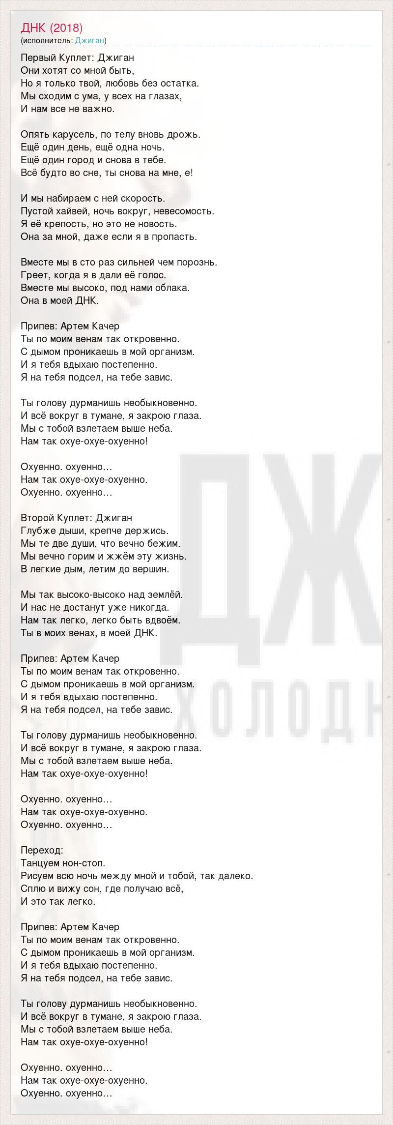 Первый Куплет: Джиган Они хотят со мной быть, Но я только твой, любовь без остатка. Мы сходим с ума, у всех на глазах, И нам все не важно. Опять карусель, по телу вновь дрожь. Ещё один день, ещё одна ночь. Ещё один город и снова в тебе. Всё будто во сне, ты снова на мне, е! И мы набираем с ней скорость. Пустой хайвей, ночь вокруг, невесомость. Я её крепость, но это не новость. Она за мной, даже если я в пропасть. Вместе мы в сто раз сильней чем порознь. Греет, когда я в дали её голос. Вместе мы высоко, под нами облака. Она в моей ДНК. Припев: Артем Качер Ты по моим венам так откровенно. С дымом проникаешь в мой организм. И я тебя вдыхаю постепенно. Я на тебя подсел, на тебе завис. Ты голову дурманишь необыкновенно. И всё вокруг в тумане, я закрою глаза. Мы с тобой взлетаем выше неба. Нам так охуе-охуе-охуенно! Охуенно. охуенно… Нам так охуе-охуе-охуенно. Охуенно. охуенно… Второй Куплет: Джиган Глубже дыши, крепче держись. Мы те две души, что вечно бежим. Мы вечно горим и жжём эту жизнь. В легкие дым, летим до вершин. Мы так высоко-высоко над землёй. И нас не достанут уже никогда. Нам так легко, легко быть вдвоём. Ты в моих венах, в моей ДНК. Припев: Артем Качер Ты по моим венам так откровенно. С дымом проникаешь в мой организм. И я тебя вдыхаю постепенно. Я на тебя подсел, на тебе завис. Ты голову дурманишь необыкновенно. И всё вокруг в тумане, я закрою глаза. Мы с тобой взлетаем выше неба. Нам так охуе-охуе-охуенно! Охуенно. охуенно… Нам так охуе-охуе-охуенно. Охуенно. охуенно… Переход: Танцуем нон-стоп. Рисуем всю ночь между мной и тобой, так далеко. Сплю и вижу сон, где получаю всё, И это так легко. Припев: Артем Качер Ты по моим венам так откровенно. С дымом проникаешь в мой организм. И я тебя вдыхаю постепенно. Я на тебя подсел, на тебе завис. Ты голову дурманишь необыкновенно. И всё вокруг в тумане, я закрою глаза. Мы с тобой взлетаем выше неба. Нам так охуе-охуе-охуенно! Охуенно. охуенно… Нам так охуе-охуе-охуенно. Охуенно. охуенно…