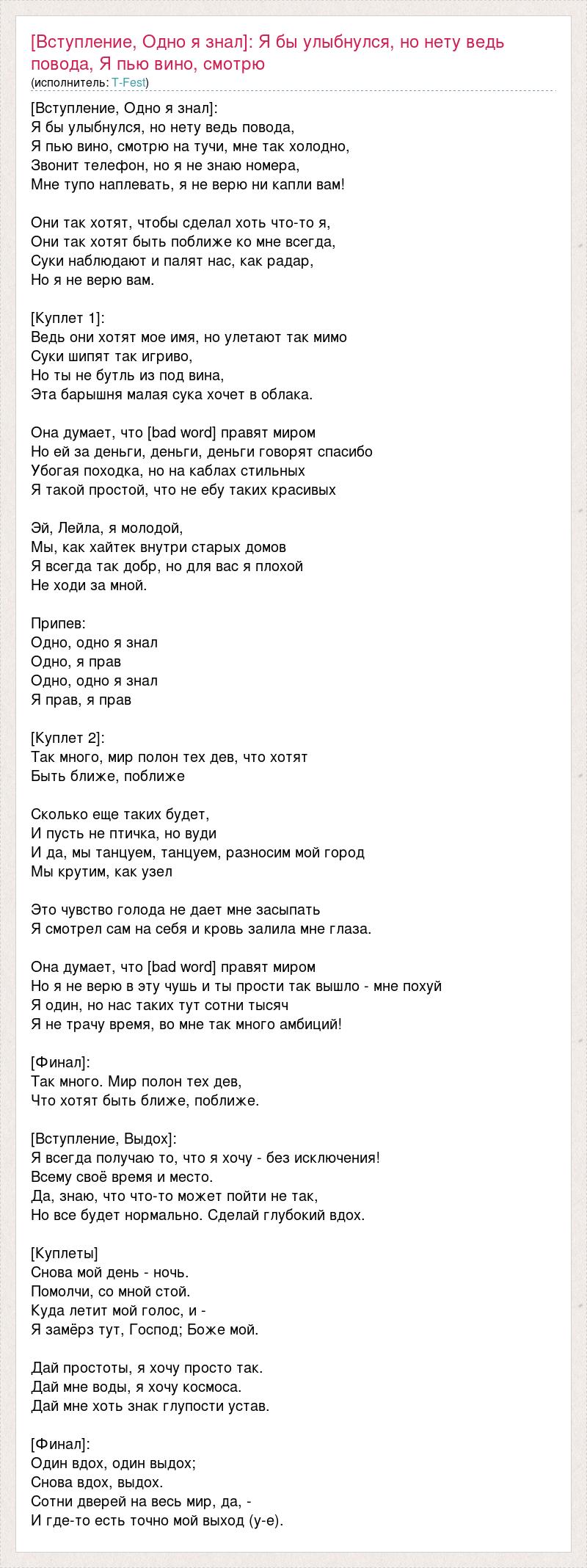 [Вступление, Одно я знал]: Я бы улыбнулся, но нету ведь повода, Я пью вино, смотрю на тучи, мне так холодно, Звонит телефон, но я не знаю номера, Мне тупо наплевать, я не верю ни капли вам! Они так хотят, чтобы сделал хоть что-то я, Они так хотят быть поближе ко мне всегда, Суки наблюдают и палят нас, как радар, Но я не верю вам. [Куплет 1]: Ведь они хотят мое имя, но улетают так мимо Суки шипят так игриво, Но ты не бутль из под вина, Эта барышня малая сука хочет в облака. Она думает, что [bad word] правят миром Но ей за деньги, деньги, деньги говорят спасибо Убогая походка, но на каблах стильных Я такой простой, что не ебу таких красивых Эй, Лейла, я молодой, Мы, как хайтек внутри старых домов Я всегда так добр, но для вас я плохой Не ходи за мной. Припев: Одно, одно я знал Одно, я прав Одно, одно я знал Я прав, я прав [Куплет 2]: Так много, мир полон тех дев, что хотят Быть ближе, поближе Сколько еще таких будет, И пусть не птичка, но вуди И да, мы танцуем, танцуем, разносим мой город Мы крутим, как узел Это чувство голода не дает мне засыпать Я смотрел сам на себя и кровь залила мне глаза. Она думает, что [bad word] правят миром Но я не верю в эту чушь и ты прости так вышло - мне похуй Я один, но нас таких тут сотни тысяч Я не трачу время, во мне так много амбиций! [Финал]: Так много. Мир полон тех дев, Что хотят быть ближе, поближе. [Вступление, Выдох]: Я всегда получаю то, что я хочу - без исключения! Всему своё время и место. Да, знаю, что что-то может пойти не так, Но все будет нормально. Сделай глубокий вдох. [Куплеты] Снова мой день - ночь. Помолчи, со мной стой. Куда летит мой голос, и - Я замёрз тут, Господ; Боже мой. Дай простоты, я хочу просто так. Дай мне воды, я хочу космоса. Дай мне хоть знак глупости устав. [Финал]: Один вдох, один выдох; Снова вдох, выдох. Сотни дверей на весь мир, да, - И где-то есть точно мой выход (y-e).
