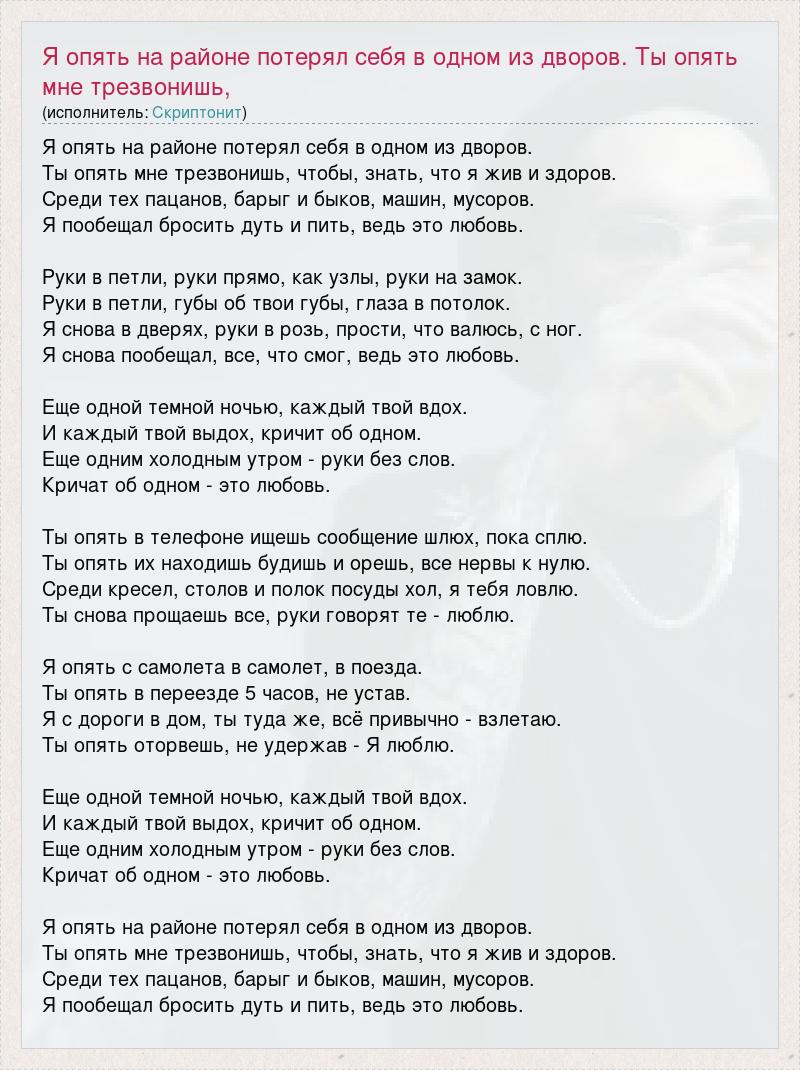 ГлавнаяИсполнителиСкриптонитЯ опять на районе потерял себя в одном из дворов. Ты опять мне трезвонишь,