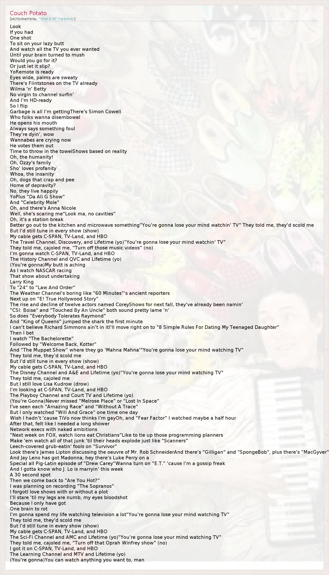 А как ты думаешь, о чем песня "Couch Potato" ?