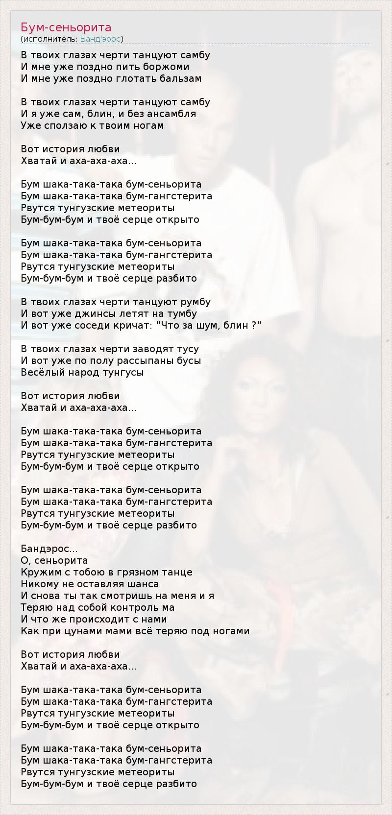В твоих глазах черти танцуют самбу И мне уже поздно пить боржоми И мне уже поздно глотать бальзам В твоих глазах черти танцуют самбу И я уже сам, блин, и без ансамбля Уже сползаю к твоим ногам Вот история любви Хватай и аха-аха-аха... Бум шака-така-така бум-сеньорита Бум шака-така-така бум-гангстерита Рвутся тунгузские метеориты Бум-бум-бум и твоё серце открыто Бум шака-така-така бум-сеньорита Бум шака-така-така бум-гангстерита Рвутся тунгузские метеориты Бум-бум-бум и твоё серце разбито В твоих глазах черти танцуют румбу И вот уже джинсы летят на тумбу И вот уже соседи кричат: "Что за шум, блин ?" В твоих глазах черти заводят тусу И вот уже по полу рассыпаны бусы Весёлый народ тунгусы Вот история любви Хватай и аха-аха-аха... Бум шака-така-така бум-сеньорита Бум шака-така-така бум-гангстерита Рвутся тунгузские метеориты Бум-бум-бум и твоё серце открыто Бум шака-така-така бум-сеньорита Бум шака-така-така бум-гангстерита Рвутся тунгузские метеориты Бум-бум-бум и твоё серце разбито Бандэрос... О, сеньорита Кружим с тобою в грязном танце Никому не оставляя шанса И снова ты так смотришь на меня и я Теряю над собой контроль ма И что же происходит с нами Как при цунами мами всё теряю под ногами Вот история любви Хватай и аха-аха-аха... Бум шака-така-така бум-сеньорита Бум шака-така-така бум-гангстерита Рвутся тунгузские метеориты Бум-бум-бум и твоё серце открыто Бум шака-така-така бум-сеньорита Бум шака-така-така бум-гангстерита Рвутся тунгузские метеориты Бум-бум-бум и твоё серце разбито