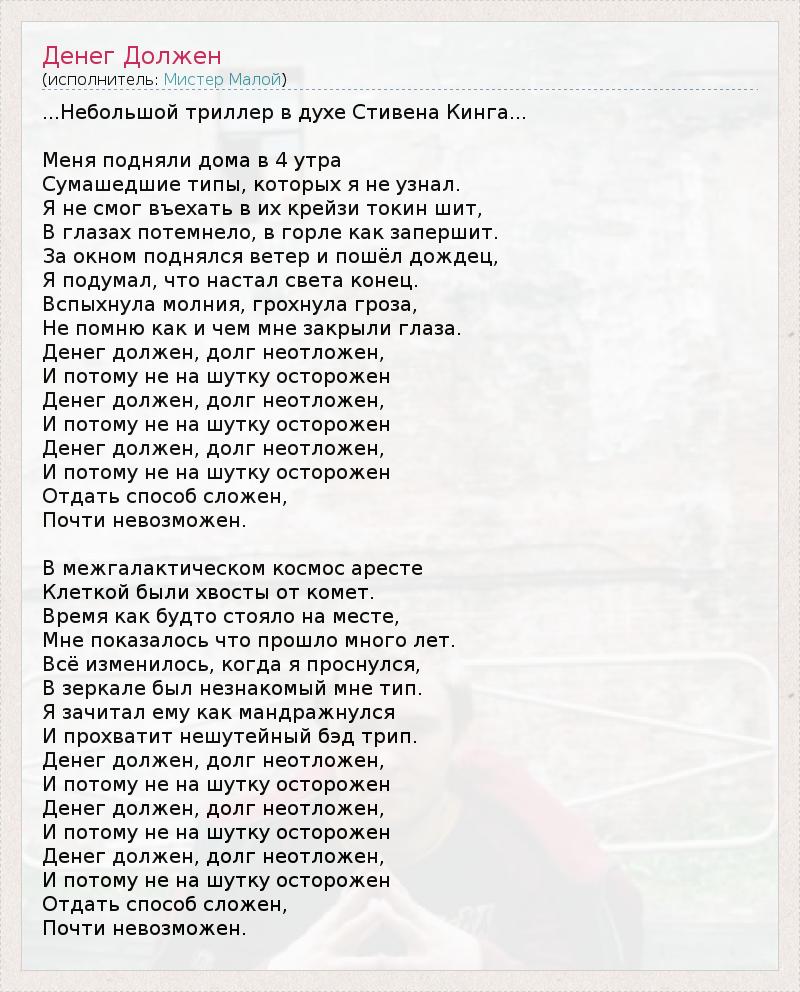 А как ты думаешь, о чем песня "Денег Должен" ?