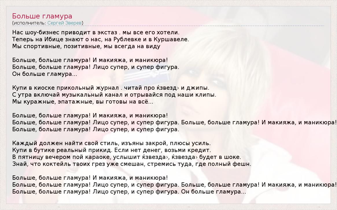 Больше, больше гламура! Лицо супер, и супер фигура. Больше, больше гламура! И макияжа, и маникюра!