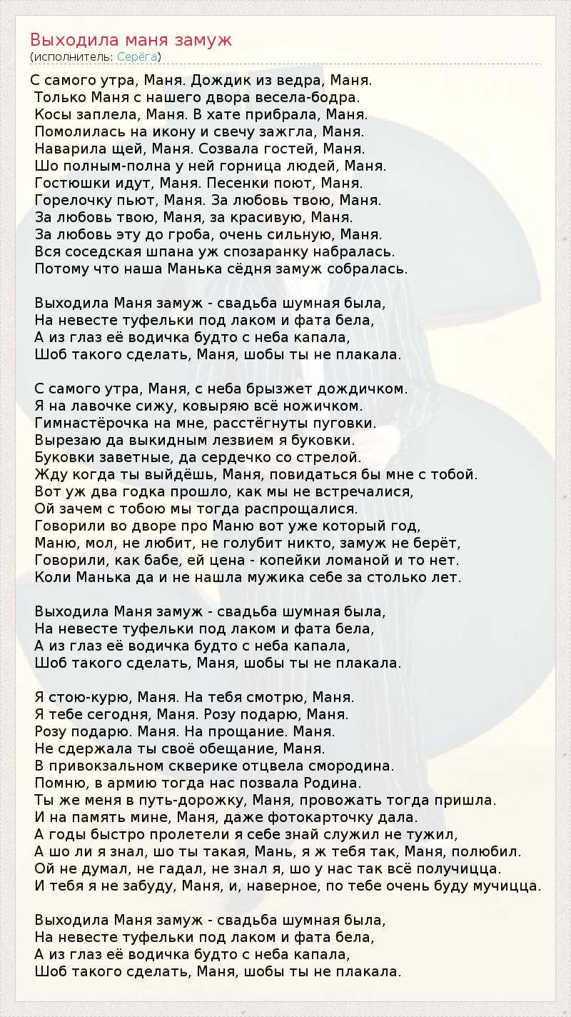 ГлавнаяИсполнителиСерёгаВыходила маня замуж