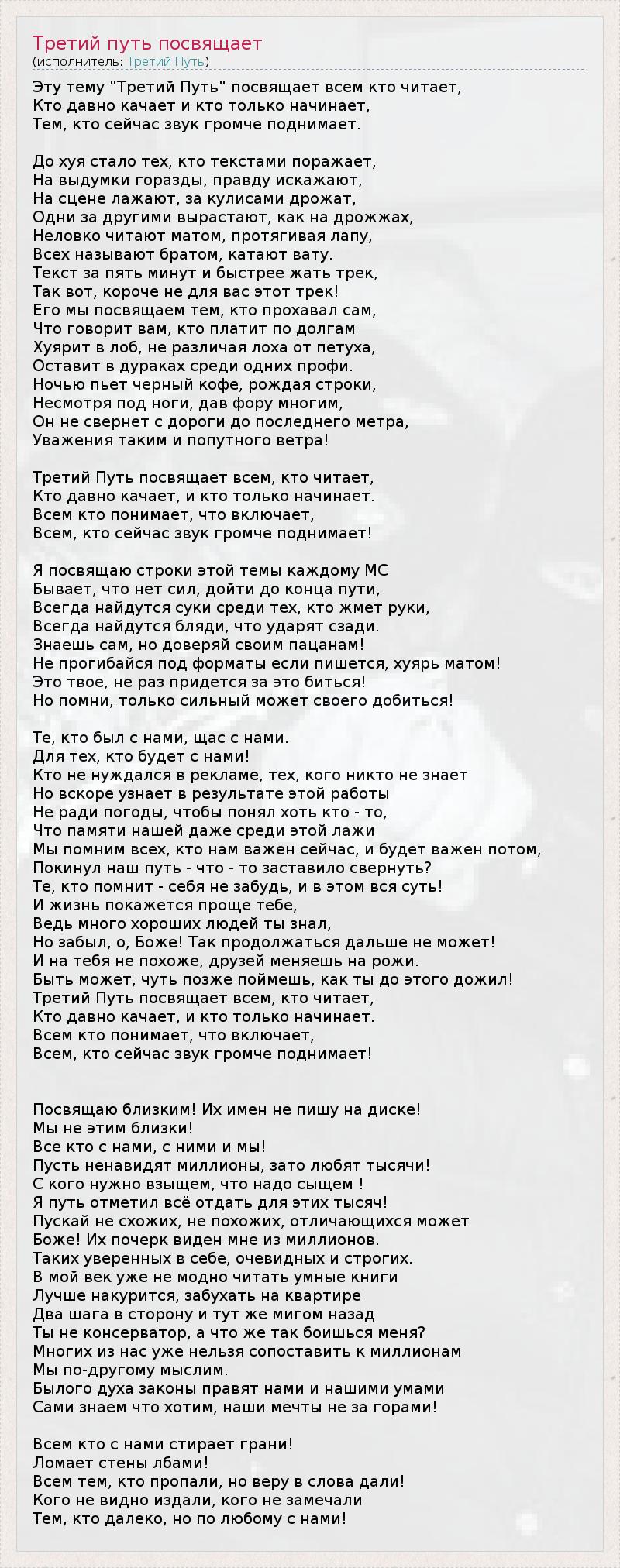 Эту тему "Третий Путь" посвящает всем кто читает, Кто давно качает и кто только начинает, Тем, кто сейчас звук громче поднимает. До хуя стало тех, кто текстами поражает, На выдумки горазды, правду искажают, На сцене лажают, за кулисами дрожат, Одни за другими вырастают, как на дрожжах, Неловко читают матом, протягивая лапу, Всех называют братом, катают вату. Текст за пять минут и быстрее жать трек, Так вот, короче не для вас этот трек! Его мы посвящаем тем, кто прохавал сам, Что говорит вам, кто платит по долгам Хуярит в лоб, не различая лоха от петуха, Оставит в дураках среди одних профи. Ночью пьет черный кофе, рождая строки, Несмотря под ноги, дав фору многим, Он не свернет с дороги до последнего метра, Уважения таким и попутного ветра! Третий Путь посвящает всем, кто читает, Кто давно качает, и кто только начинает. Всем кто понимает, что включает, Всем, кто сейчас звук громче поднимает! Я посвящаю строки этой темы каждому МС Бывает, что нет сил, дойти до конца пути, Всегда найдутся суки среди тех, кто жмет руки, Всегда найдутся бляди, что ударят сзади. Знаешь сам, но доверяй своим пацанам! Не прогибайся под форматы если пишется, хуярь матом! Это твое, не раз придется за это биться! Но помни, только сильный может своего добиться! Те, кто был с нами, щас с нами. Для тех, кто будет с нами! Кто не нуждался в рекламе, тех, кого никто не знает Но вскоре узнает в результате этой работы Не ради погоды, чтобы понял хоть кто - то, Что памяти нашей даже среди этой лажи Мы помним всех, кто нам важен сейчас, и будет важен потом, Покинул наш путь - что - то заставило свернуть? Те, кто помнит - себя не забудь, и в этом вся суть! И жизнь покажется проще тебе, Ведь много хороших людей ты знал, Но забыл, о, Боже! Так продолжаться дальше не может! И на тебя не похоже, друзей меняешь на рожи. Быть может, чуть позже поймешь, как ты до этого дожил! Третий Путь посвящает всем, кто читает, Кто давно качает, и кто только начинает. Всем кто понимает, что включает, Всем, кто сейчас звук громче поднимает! Посвящаю близким! Их имен не пишу на диске! Мы не этим близки! Все кто с нами, с ними и мы! Пусть ненавидят миллионы, зато любят тысячи! С кого нужно взыщем, что надо сыщем ! Я путь отметил всё отдать для этих тысяч! Пускай не схожих, не похожих, отличающихся может Боже! Их почерк виден мне из миллионов. Таких уверенных в себе, очевидных и строгих. В мой век уже не модно читать умные книги Лучше накурится, забухать на квартире Два шага в сторону и тут же мигом назад Ты не консерватор, а что же так боишься меня? Многих из нас уже нельзя сопоставить к миллионам Мы по-другому мыслим. Былого духа законы правят нами и нашими умами Сами знаем что хотим, наши мечты не за горами! Всем кто с нами стирает грани! Ломает стены лбами! Всем тем, кто пропали, но веру в слова дали! Кого не видно издали, кого не замечали Тем, кто далеко, но по любому с нами!