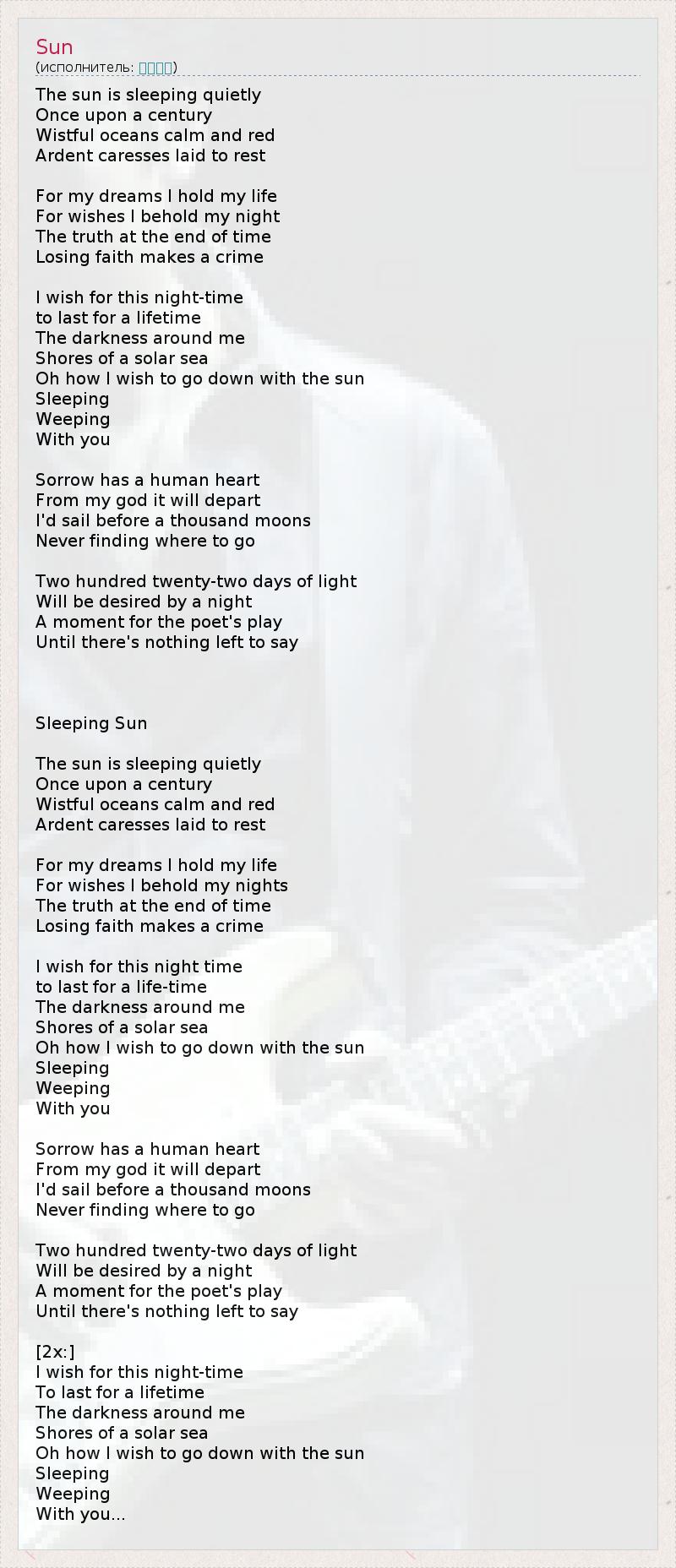 Неслышно засыпает солнце Вот уж сотни-сотен лет. Тоскующие океаны присмирели и зарделись, Пылкие их ласки утихли... Ради мечты я берегу жизнь, Ради желаний я ухожу в ночь. Истина там – в конце пути, Потерять веру – совершить злодеяние... Хочу, чтобы эта ночь Продолжалась всю жизнь. Окружающая меня тьма - Это берега солнечного моря.... О, как хочу я закатиться вместе с солнцем, Которое засыпает И плачет С тобой... Скорбь овладевает человеческим сердцем, Она отступит от моего Бога. Не сменится и тысяча лун, я уплыву Ища, и никогда не найдя пристанища... Двести двадцать два дня света Будет жаждать всего одна ночь - Мгновение для поэтической игры, Пока не иссякнут слова... Солнце в грёзах* (перевод Shadow Wizard из Москвы) Раз в столетье Солнце спит, Лучей сиянье погасив; Их иссякает водопад, Тепло и свет несущий нам. Жизнь в мечтах проходит прочь, Впереди желаний ночь, Веру под конец времён Не теряй – таков закон. Хочу, чтоб ночь эта Продолжилась вечно, Чтобы мрак море света Одел в берега; Как я хочу, словно Солнце, уйти – В грёзы, Слёзы, С тобой. В сердце пусть царит печаль – Мой бог прогонит её вдаль, Я много тысяч лун в пути – Но всё ищу, куда идти. Две с лишним сотни светлых дней Одной лишь ночи не ценней – Поэтов время волшебства, Пока не кончатся слова… [2x:] Хочу, чтоб ночь эта Продолжилась вечно, Чтобы мрак море света Одел в берега; Как я хочу, словно Солнце, уйти – В грёзы, Слёзы, С тобой... * поэтический перевод с элементами творческой интерпретации