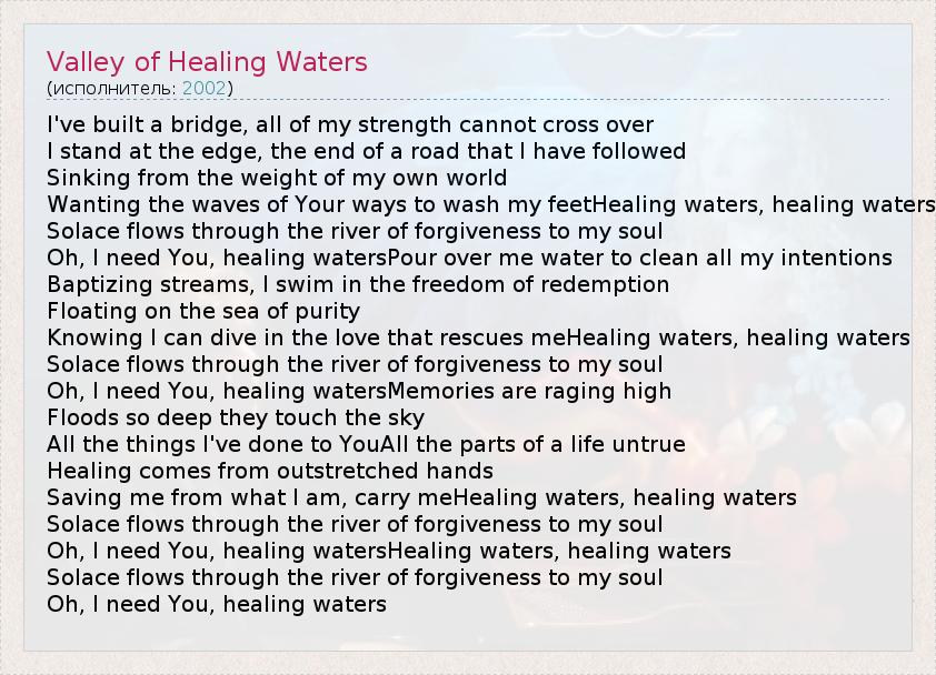 А как ты думаешь, о чем песня "Valley of Healing Waters" ?