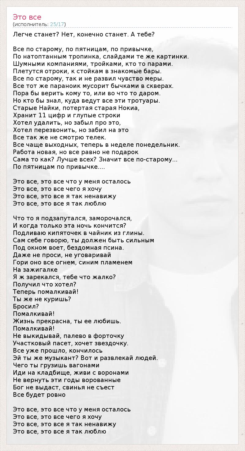 "Релизы, изданные до этого, выходили под заголовком "Иезекииль 25:17 представляет…", и были проектами, где мы являлись объединяющим звеном. Альбом "Только для своих" максимально точно отражает наши взгляды, передает наши эмоции. Это не мы решаем, кто для нас "свои", это наши слушатели решают, "свои" ли они для нас, а мы для них", – говорят участники 25/17.